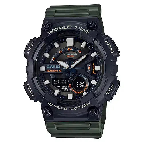 Master time zones with the dynamic Casio Analog-Digital World Time AEQ-110W-3AVDF Men's Watch. This versatile timepiece features a striking green dial with bold analog hands and integrated digital sub-dials, providing instant access to World Time, stopwatch, timer, and alarms. With its durable green resin strap, 100-meter water resistance, and an impressive 10-year battery life, the AEQ-110W-3AVDF is built for reliability and active lifestyles. Its unique combination of analog elegance and digital utility, along with Telememo, makes it an indispensable accessory for any modern explorer.