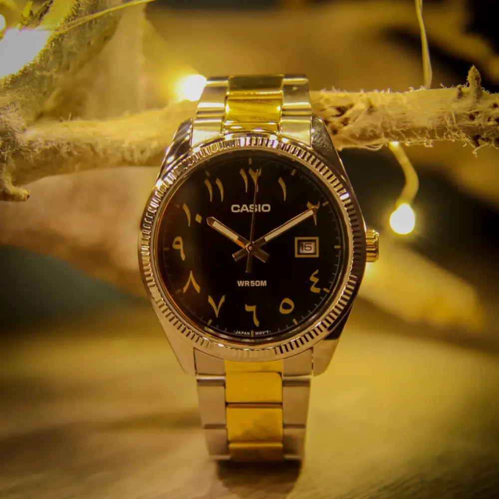 Experience timeless style and functionality with the Casio Classic Analog MTP-1302SG-1B3 men's watch. This elegant timepiece features a refined black dial with prominent Arabic numerals and gold-tone accents, housed within a durable 38.5mm case. Powered by a precise quartz movement, this watch provides reliable timekeeping and a convenient date display at the 3 o'clock position. The watch is completed by a sophisticated two-tone stainless steel bracelet, offering a classic look that is perfect for both daily wear and special occasions. With a scratch-resistant mineral glass and a water resistance of 50 meters, the Casio MTP-1302SG-1B3 is a dependable accessory that combines a vintage-inspired aesthetic with modern durability.