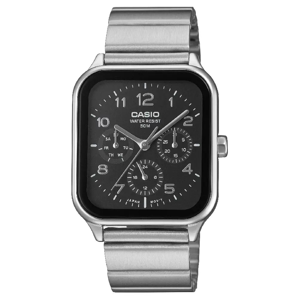 The Casio Classic Analog Multi-Dial MTP-M306D-1A is a sleek and highly practical men's timepiece, offering reliable timekeeping and enhanced calendar functionality in a clean design. This watch is powered by a precise Quartz movement. The timepiece features a classic black dial with three inset sub-dials that conveniently track the date, day of the week, and a 24-hour clock. The watch is housed within a durable, slim 40mm stainless steel case (9.4mm thickness). It is protected by a scratch-resistant Mineral Glass and is completed by a robust stainless steel bracelet with a one-touch 3-fold clasp. With a low-profile design and a water resistance rating of 50 meters (5 Bar), the Casio MTP-M306D-1A is a dependable and stylish accessory suitable for daily wear.