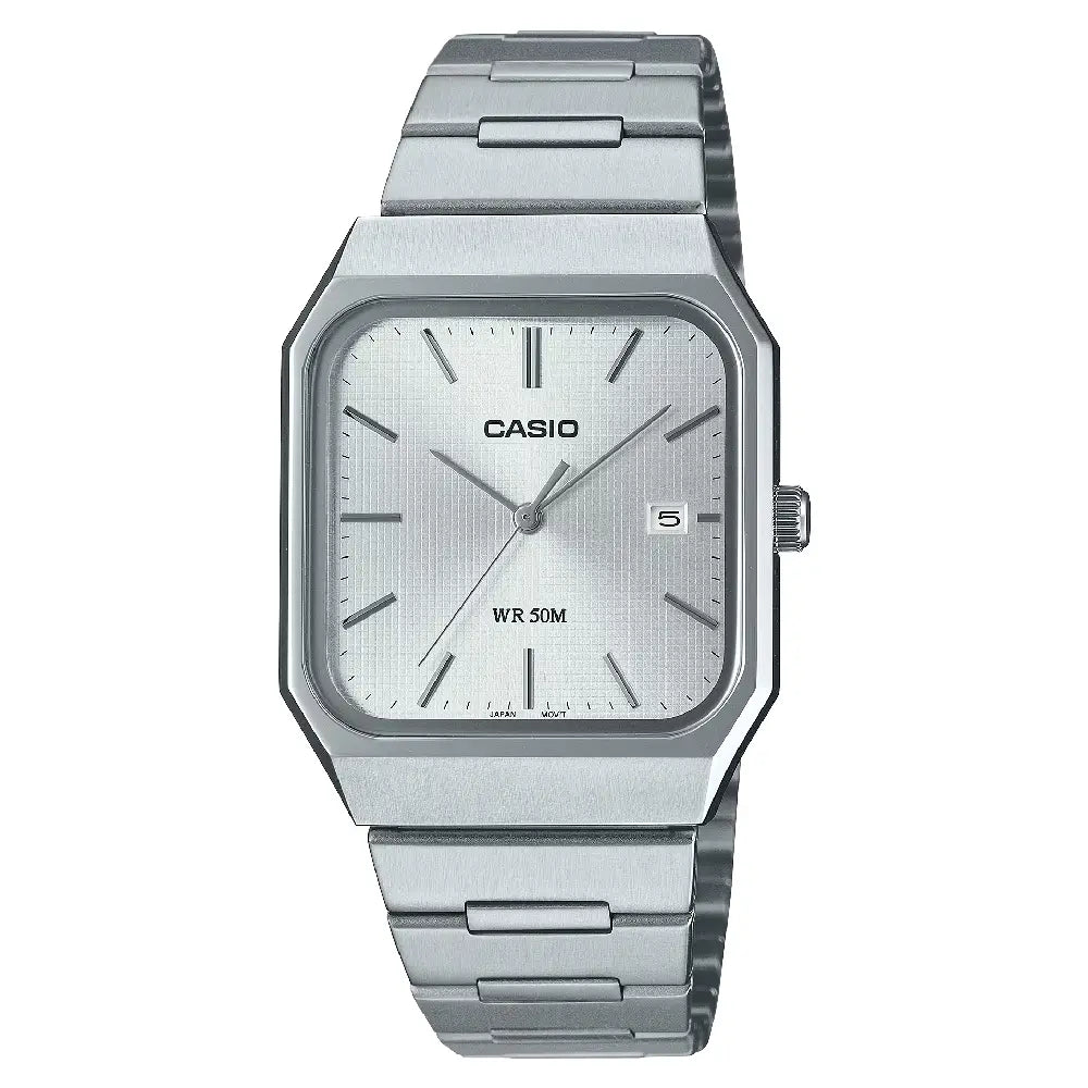 The Casio MTP-B185D-7AVDF is a simple and elegant analog watch, perfect for everyday and professional wear. Part of the Casio Collection, this timepiece features a striking silver dial with luminous hands and hour markers for excellent readability. The watch is housed in a durable stainless steel case and is complemented by a matching stainless steel bracelet. It includes a convenient date display at the 3 o'clock position and is 50-meter water resistant, making it suitable for daily use, handling splashes and rain. Powered by a reliable quartz movement, this watch is a versatile and elegant accessory.