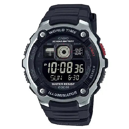 Navigate your day with precision using the Casio Digital Multi-Time AE-2000W-1BVDF Men's Watch. Inspired by aircraft cockpit instruments, its black digital dial features a unique multi-segment display and analog sub-dial, offering at-a-glance access to global time. With a rugged black resin strap, an exceptional 200-meter water resistance, and an amazing 10-year battery life, the AE-2000W-1BVDF is built for enduring performance. This feature-rich timepiece is perfect for travelers and active individuals seeking reliability, advanced multi-time functions, and a distinctive design.