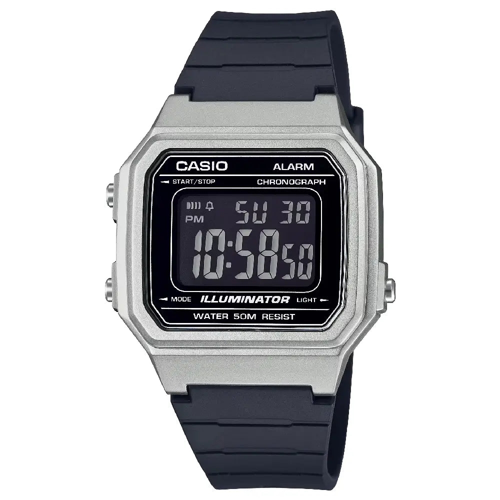 The Casio W-217HM-7BVDF is a durable and practical digital watch with a vintage-inspired, sporty design. Its most notable features are a long-lasting 7-year battery life and a sleek, reverse LCD display. The watch includes a 1/100-second stopwatch, a daily alarm, and an LED backlight for visibility in the dark. With 50-meter water resistance, it is suitable for everyday use and light water exposure. Its tough black resin case and comfortable black resin strap make it an excellent choice for a no-fuss, everyday timepiece.