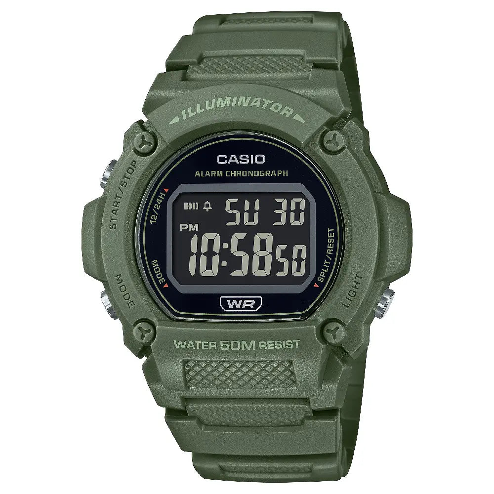 The Casio W-219HC-3BVDF is a durable and practical digital watch known for its classic square-face design. This model features a black resin case and a black-to-green gradient bezel for a bold, sporty look. It includes a stopwatch, a daily alarm, an hourly time signal, and an LED backlight for easy reading in the dark. It is 50-meter water resistant, making it suitable for swimming and everyday use. The watch is powered by a long-lasting battery, offering years of use without replacement. Its durable construction and comfortable resin strap make it an excellent choice for a no-fuss, everyday timepiece.