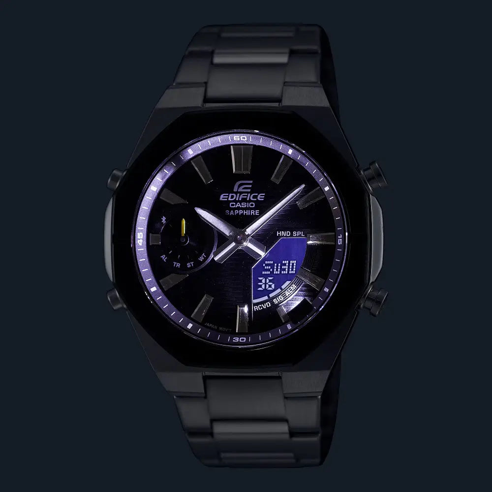 The Casio Edifice ECB-S10DB-1A is a high-performance analog-digital combination watch designed for professionals who value both technical precision and a low-profile fit. A standout in the Slim Line series, it features a remarkably thin 9.6mm case, allowing it to sit comfortably under a shirt cuff. The design is anchored by a flat, octagonal bezel with a black ion-plated finish, giving it a sharp, sporty aesthetic inspired by the dashboard instruments of professional racing teams.Equipped with Smartphone Link (Bluetooth) technology, this timepiece automatically synchronizes with your phone four times a day to ensure absolute accuracy. It is built with a scratch-resistant sapphire crystal, a premium feature that provides exceptional clarity and durability. With 100-meter water resistance and a dual LED Super Illuminator, it is a versatile tool for international travel, business meetings, and active lifestyles.