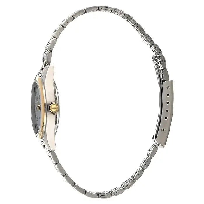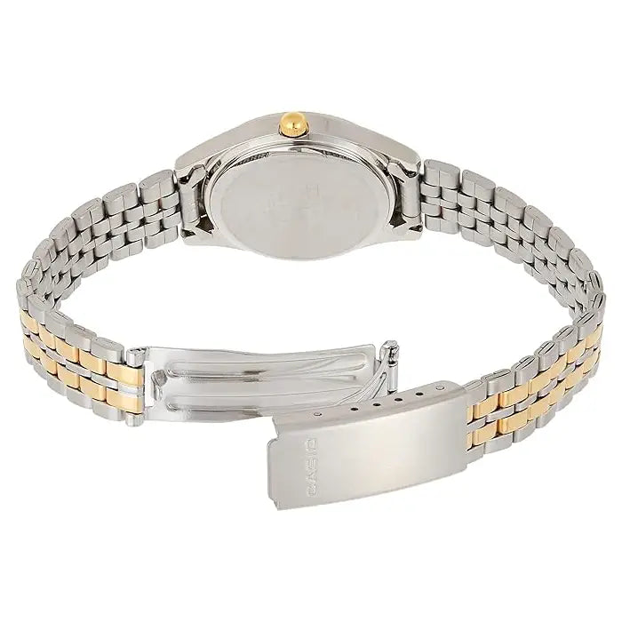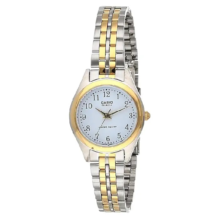 The Casio LTP-1129G-7BRDF is a classic and elegant timepiece designed for women. Part of the Enticer Ladies collection, this watch features a sophisticated two-tone (silver and gold) stainless steel case and a matching Stainless Steel Women's Watch. The clean white analog dial is easy to read, with gold-tone hands and markers that complement the two-tone case and bracelet. This timepiece is designed for both style and practicality, offering 30-meter water resistance and a durable mineral glass crystal. It runs on a reliable quartz movement, making it a perfect accessory for both casual and formal occasions.