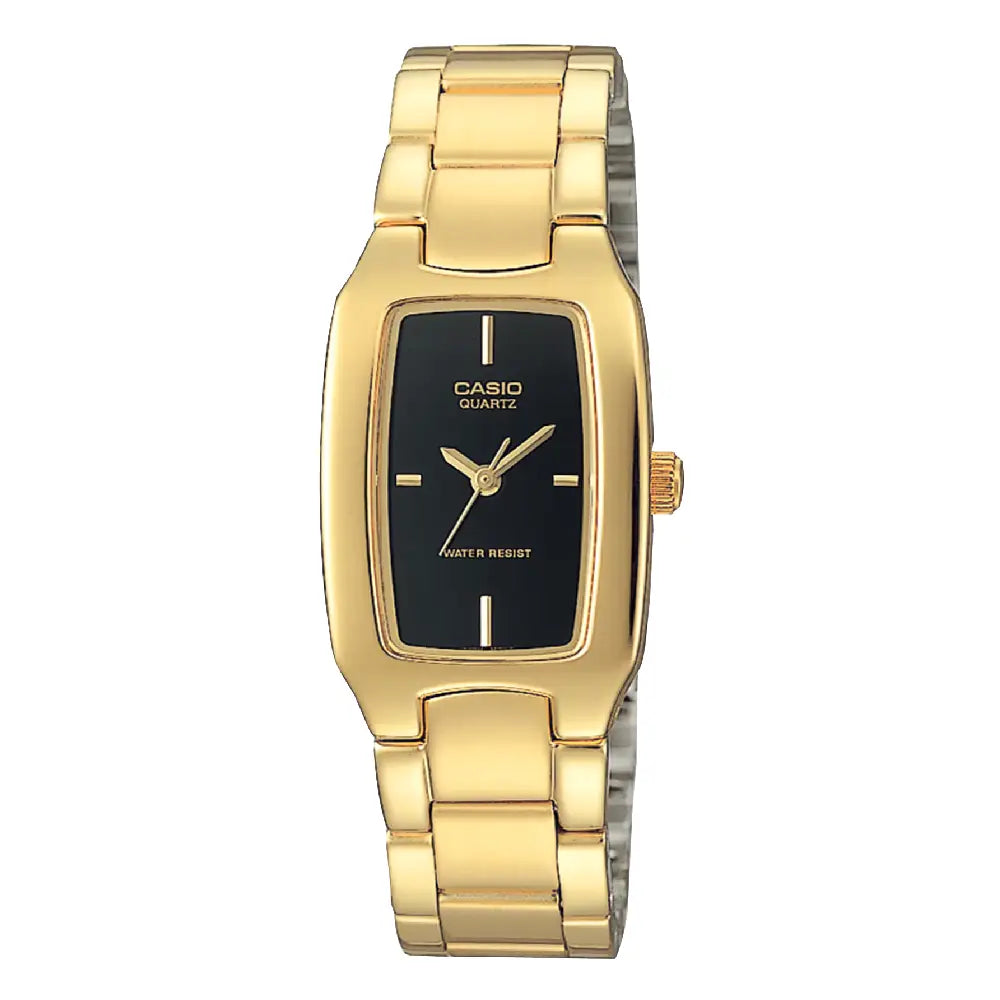 The Casio LTP-1165N-1CRDF is a classic and elegant timepiece designed for women. Part of the Enticer Ladies collection, this watch features a durable gold-tone stainless steel case and a matching Stainless Steel Women's Watch. The sophisticated black analog dial is easy to read, with contrasting gold-tone hands and markers. The simple design makes it a versatile accessory for any occasion. This timepiece is designed for both style and practicality, offering water resistance and a durable mineral glass crystal. It runs on a reliable quartz movement, making it a timeless addition to any wardrobe.