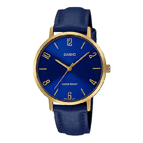 The Casio LTP-VT01GL-2BUDF is a minimalist and elegant timepiece designed for women. Part of the Enticer Ladies collection, this watch features a durable gold-tone case that beautifully complements the blue analog dial. It is paired with a matching blue Leather strap. The simple, three-hand design is both stylish and easy to read. This timepiece is designed for practicality, offering water resistance for daily use and a durable mineral glass crystal. It runs on a reliable quartz movement, making it a perfect accessory for both professional and casual occasions.