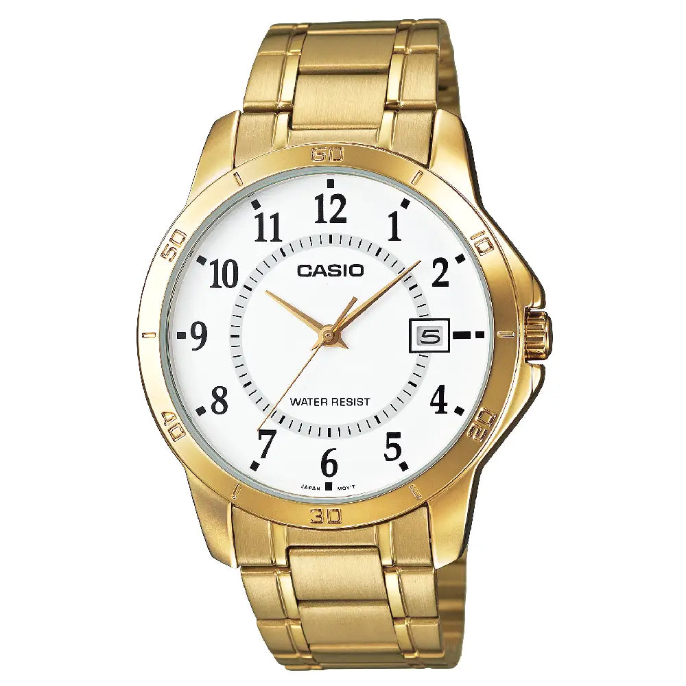 The Casio Enticer MTP-V004G-7BUDF is a simple yet elegant timepiece with a luxurious gold-toned finish. Its classic white dial features a clear day and date display at the 3 o'clock position, along with a clean three-hand analog display. The watch is powered by a reliable quartz movement and is water-resistant for daily use. The durable gold-toned stainless steel case and a matching Stainless Steel band give it a robust and timeless look, making it a versatile accessory for any occasion.