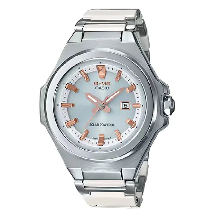 The Casio Baby-G G-MS MSG-S500CD-7A is a sophisticated and versatile timepiece from the G-MS lineup, designed for the active, modern woman who needs a watch that transitions seamlessly from work to leisure. This model features a clean Silver Dial with a minimalist 3-hand analog display and a date window, framed by a polished stainless steel bezel. This watch is powered by Casio's Tough Solar technology, ensuring reliable operation without the need for regular battery changes. The case measures a comfortable 37.1mm in width and has a slim 10.5mm profile. A standout feature is the Composite Band (Solid Band), which combines fine resin with stainless steel links. This construction offers the premium look of metal with the lightweight comfort and durability of resin. Key features include a Date display, low battery alert, and a screw-lock crown. The dial is protected by Mineral Glass. With a water resistance rating of 100 meters (10 Bar) and signature shock resistance, the MSG-S500CD-7A is a refined yet robust accessory for everyday wear.