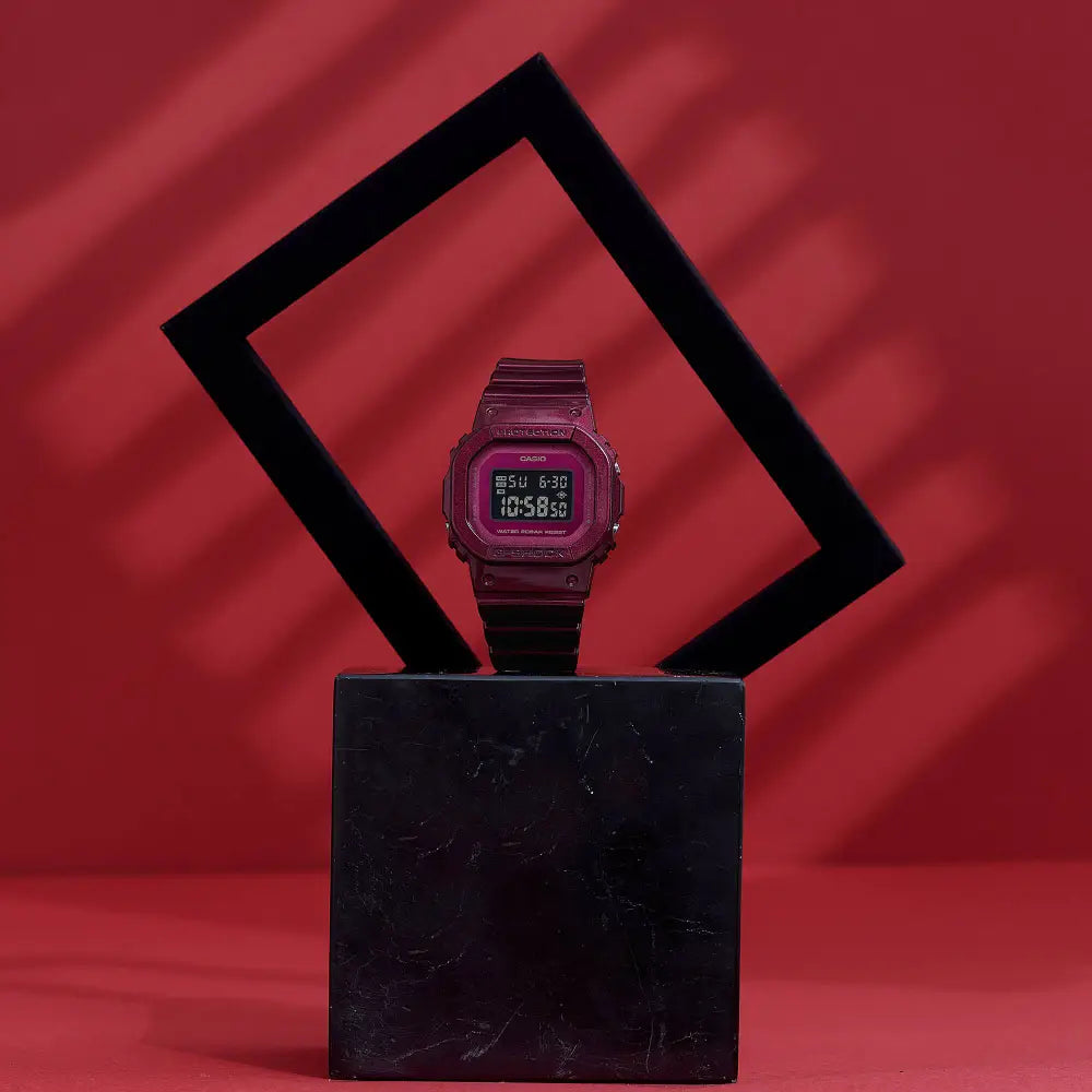 The Casio G-Shock GMD-S5600RB-4DR is a bold and sophisticated addition to the "S-Series" compact line, designed for those who find standard G-Shocks too bulky but refuse to compromise on toughness. Part of the special "Red and Black" Collection, this model pairs a vibrant Matte Red Resin strap and bezel with a sleek black face. The standout feature is the dial's Metallic Vapor Deposition Finish, which adds a shimmering, jewelry-like quality to the display border, elevating the watch from a simple tool to a fashion statement. Housed in a slimmer, more wearable 40.5mm Square Case (based on the iconic DW-5600 DNA), this watch is significantly thinner (11.9mm) than its full-sized counterparts, making it slide easily under a jacket cuff. Despite its smaller stature, it retains the legendary Shock Resistance and 200-meter water resistance that define the brand. The digital display is crisp and functional, powered by Module 3523, offering a suite of essential tools including a stopwatch, countdown timer, and multi-function alarms. The Super Illuminator LED ensures the screen is legible even in pitch darkness. With its unique mix of aggressive red styling and elegant metallic details, the GMD-S5600RB-4DR is perfect for the active woman who wants to stand out.
