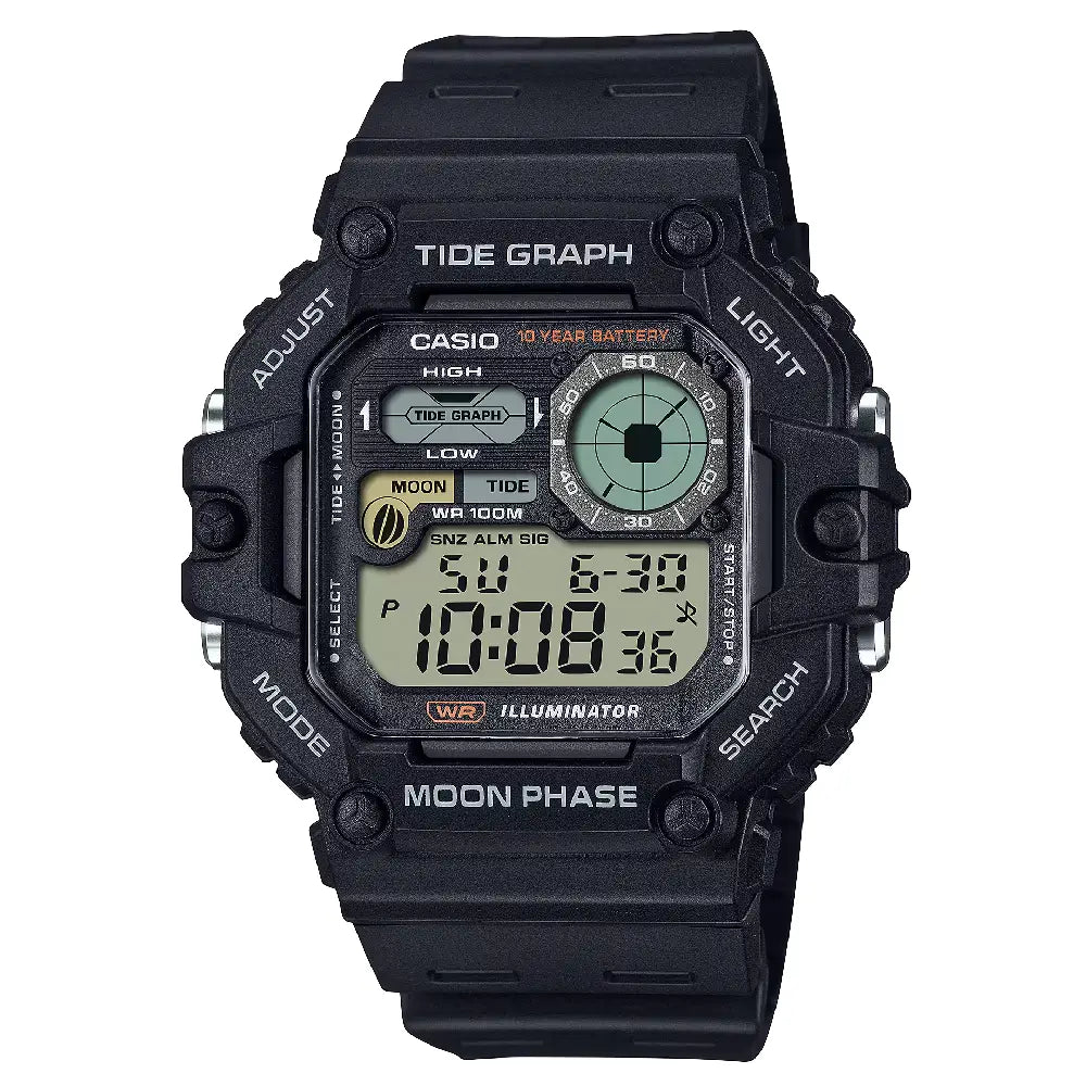 The Casio Sports WS-1700H-1AVDF is a durable and highly functional digital watch designed for marine and outdoor enthusiasts. Its standout features include a Tide Graph that displays current tide conditions and a Moon Data feature that shows the moon's age and phase. It also boasts a long-lasting 10-year battery life, dual time, a stopwatch, and an LED backlight. With 100-meter water resistance, it is suitable for swimming and water sports. The watch's tough black resin case and comfortable resin strap ensure durability and a secure fit for any activity.