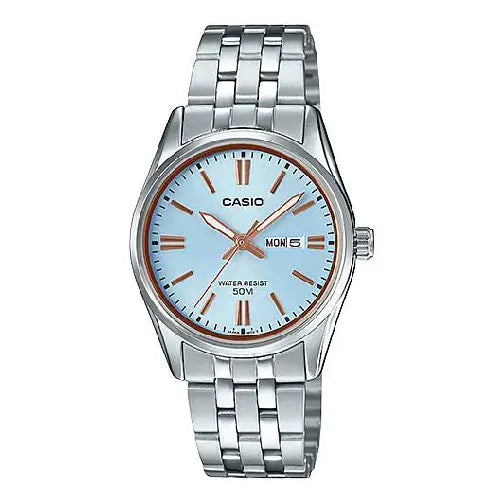 The Casio LTP-1335D-2AVDF is a classic and reliable timepiece designed for women. Part of the Standard Analog collection, this watch features a durable silver stainless steel round case and a matching Stainless Steel Women's Watch. The sophisticated blue analog dial is easy to read and includes a convenient date display at the 3 o'clock position. The design is both timeless and practical, offering a clear display and 50-meter water resistance. It runs on a reliable quartz movement, making it a perfect addition to any wardrobe for both casual and professional settings.