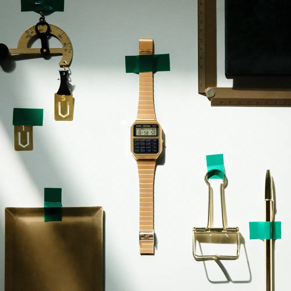 The Casio Vintage Calculator Digital CA-500WEG-1A is a stylish and nostalgic unisex timepiece that revives the iconic calculator watch design from the 1980s with a premium metallic finish. This model is part of the popular Casio Vintage collection, celebrated for its "retro-futuristic" appeal. This watch is powered by a reliable Quartz digital movement with an approximate battery life of five years. The timepiece features a classic digital display with an 8-digit calculator keypad integrated directly into the case face. The case is crafted from resin with a gold-tone chrome plated finish, measuring a compact 34.4mm in width (43.2mm length) and a slim 8.2mm profile. Key functions include Dual Time, a 1/100-second stopwatch, a daily alarm, and an auto-calendar. The dial is protected by Resin Glass. It is completed by a matching gold ion-plated stainless steel bracelet with an adjustable clasp. Rated as Water Resistant, this watch is suitable for daily wear and resistant to minor splashes.