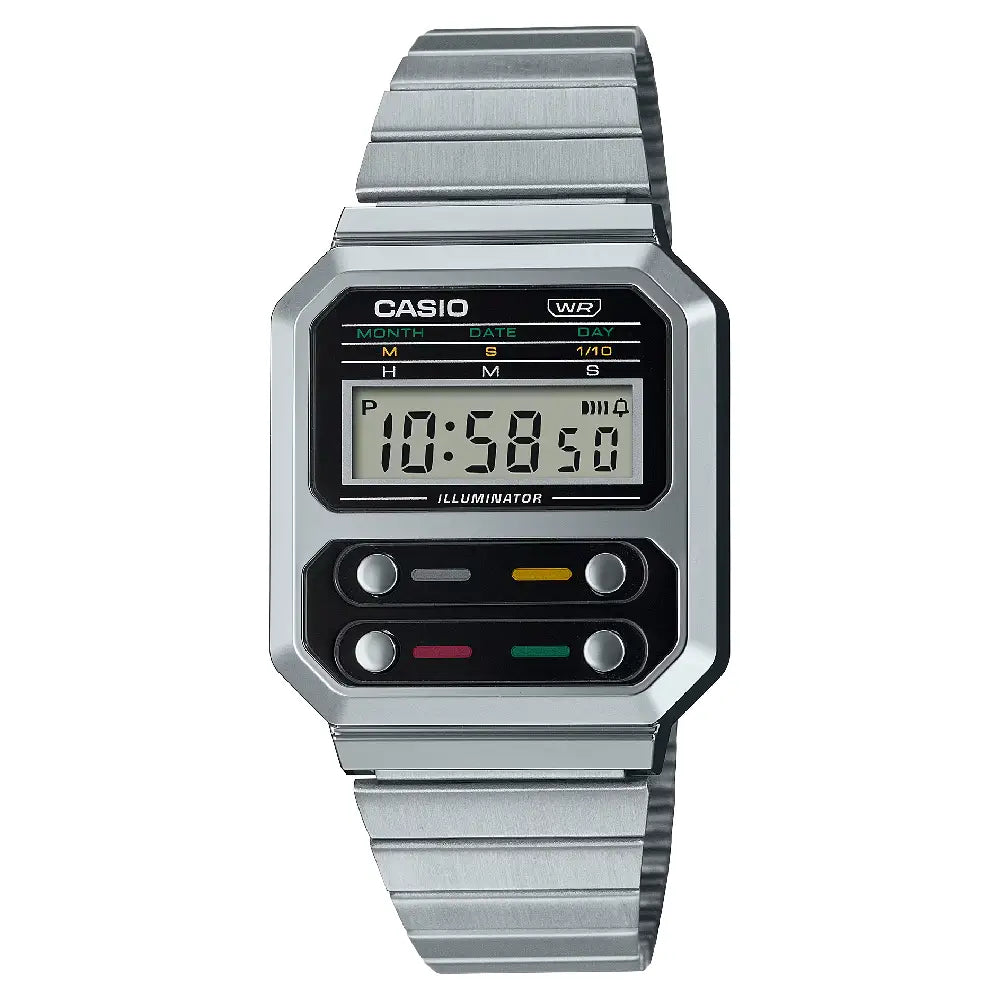 Indulge in nostalgic charm with modern functionality with the Casio Vintage Digital A100WE-1ADF Unisex's Watch. This timepiece pays homage to Casio's classic F-100, featuring its distinctive four front-button design and a sleek silver-tone stainless steel band that's easily adjustable. The clear digital display offers practical features like a 1/10-second stopwatch, daily alarm, and auto-calendar, all illuminated by an LED backlight for easy reading. Water-resistant and built for everyday wear, the A100WE-1ADF perfectly blends iconic retro style with contemporary reliability, making it a versatile accessory for any enthusiast.