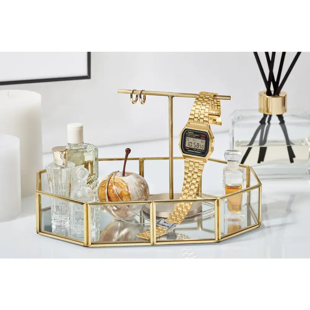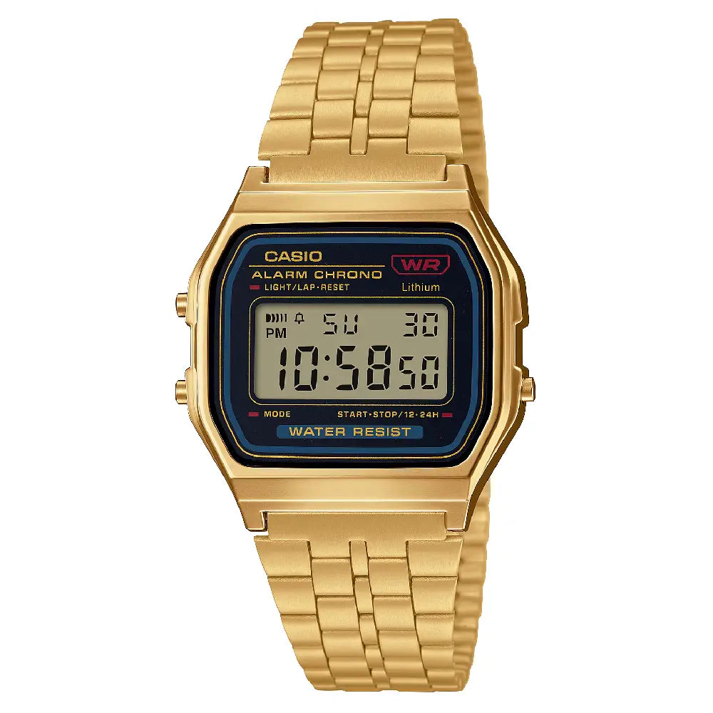 Elevate your retro style with a touch of radiant elegance with the Casio Vintage Digital A159WGEA-1DF Unisex Watch. This iconic timepiece features a beloved classic design, enhanced by a genuine sparkling diamond set on its black digital dial. Complementing its sophisticated aesthetic are a durable gold ion-plated stainless steel case and a matching stainless steel. Essential functions include a 1/100-second stopwatch, daily alarm, and an auto-calendar, all illuminated by a green LED backlight. Water-resistant and celebrated for its timeless appeal, the A159WGEA-1DF is a versatile accessory that seamlessly blends vintage charm with subtle luxury and reliable modern performance.