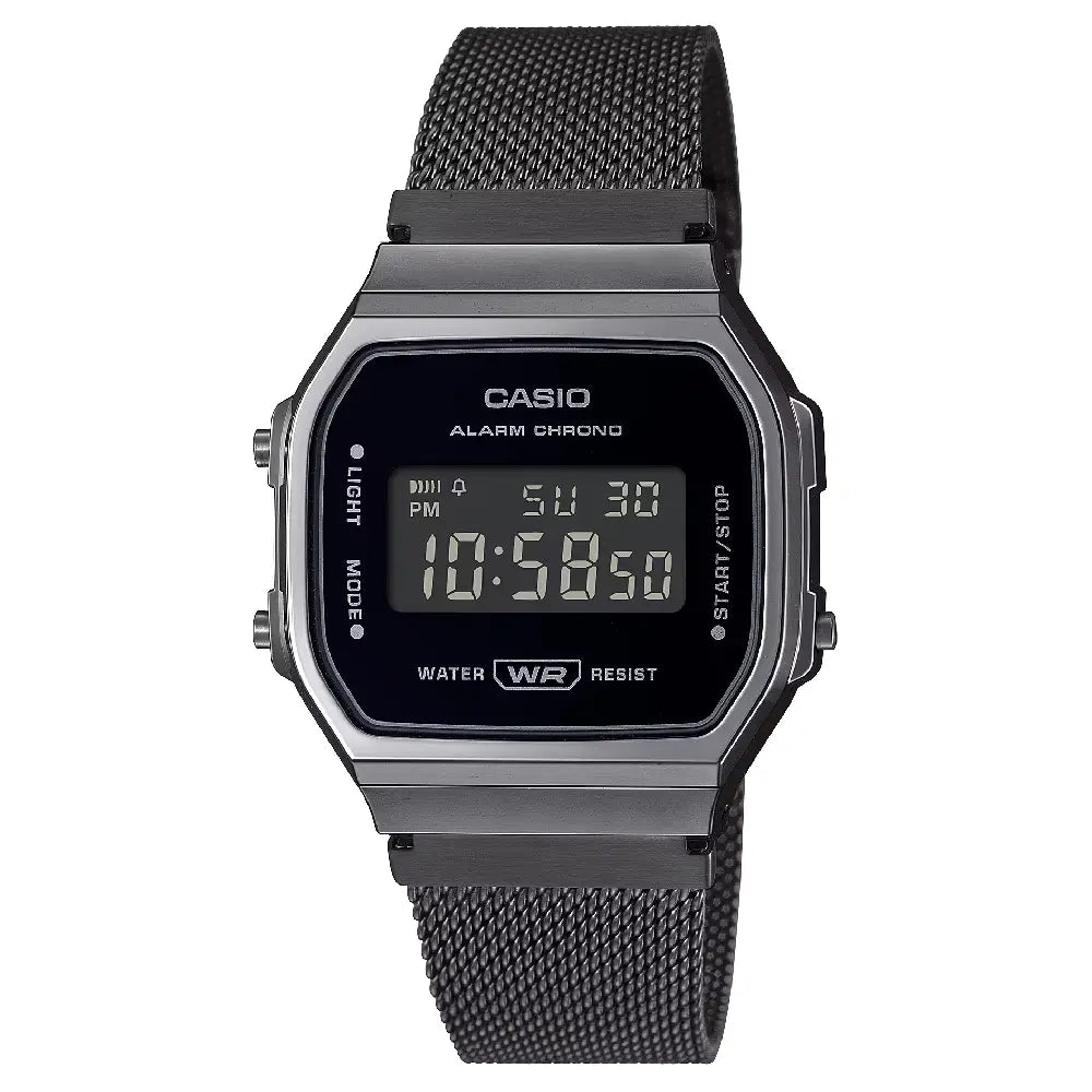 Embrace sophisticated minimalism with the Casio Vintage Digital A168WEMB-1BDF Unisex Watch. This iconic timepiece features a beloved retro design, distinguished by its sleek black ion-plated stainless steel case and a refined matching mesh. Its crisp black digital dial is brilliantly illuminated by its signature Electro-luminescent backlight. Essential functions include a 1/100-second stopwatch, daily alarm, and an auto-calendar. Water-resistant and celebrated for its timeless appeal and exceptional durability, the A168WEMB-1BDF is a versatile and essential accessory that effortlessly blends vintage aesthetics with reliable modern performance for any wrist.