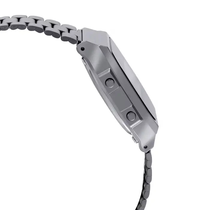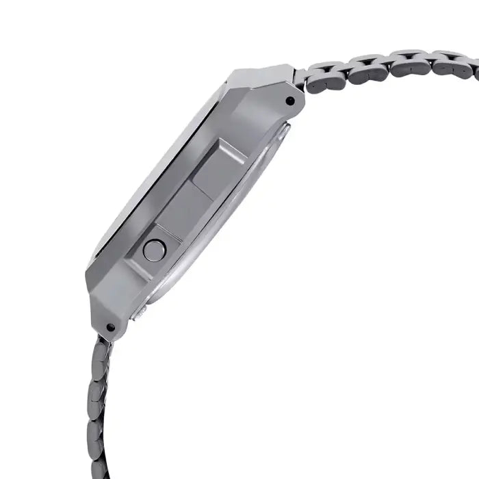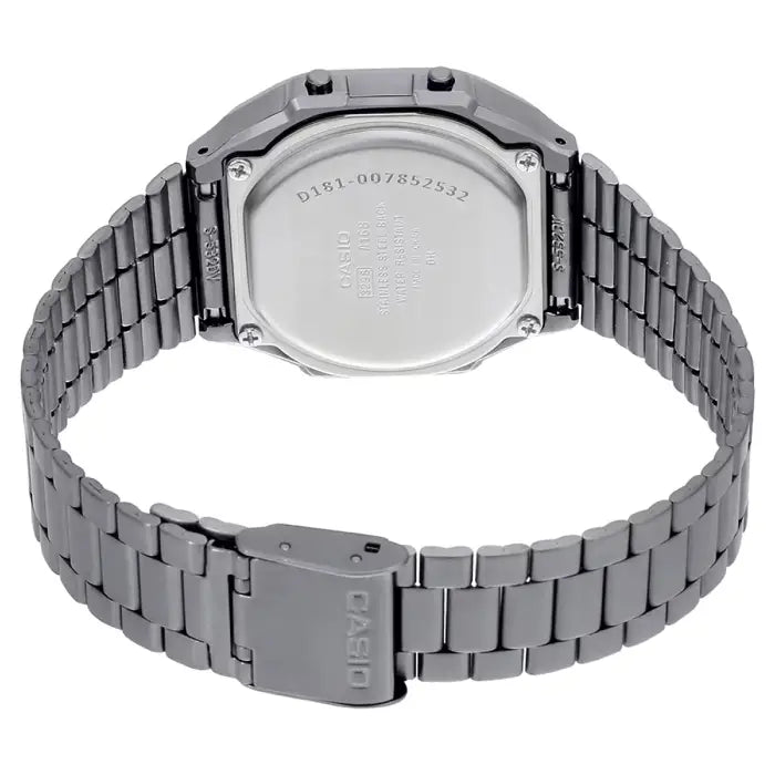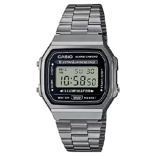 Command a sleek, modern vintage look with the Casio Vintage Digital A168WGG-1ADF Unisex Watch. This iconic timepiece features a beloved retro design, distinguished by its striking gunmetal grey ion-plated stainless steel case and matching stainless steel. Its crisp black digital dial is brilliantly illuminated by its signature Electro-luminescent backlight. Essential functions include a 1/100-second stopwatch, daily alarm, and an auto-calendar. Water-resistant and celebrated for its timeless appeal and exceptional durability, the A168WGG-1ADF is a versatile and essential accessory that effortlessly blends vintage aesthetics with reliable modern performance, making it a bold statement piece for any collection.