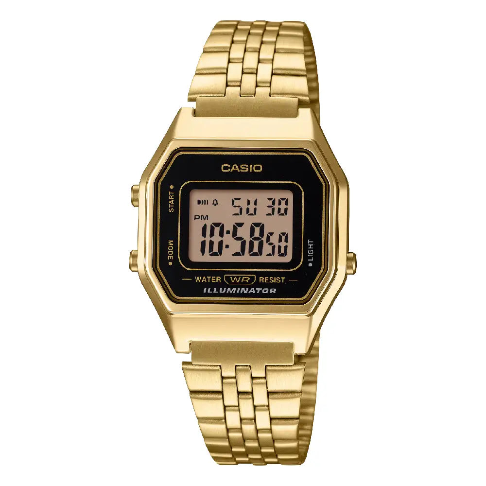 The Casio LA680WGA-1DF is a timeless and compact digital watch from the Casio Vintage collection, celebrated for its retro design with a touch of luxury. It features a durable resin case with a polished gold tone and a sophisticated, adjustable gold-toned Stainless Steel band. The watch's clear digital display has a classic black dial with an LED backlight and is complemented by a reliable quartz movement. It offers essential functions including a 1/100-second stopwatch, a daily alarm, and an auto-calendar. Its simple yet elegant design makes it a versatile accessory for women looking for a blend of vintage style and modern functionality.