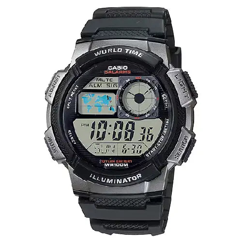 Navigate the globe from your wrist with the Casio World Time Digital AE-1000W-1BVDF Men's Watch. This highly functional timepiece features a clear black digital dial accented with a graphical world map and striking red/orange details, allowing you to easily track time in 48 cities worldwide. Built for endurance with its durable black resin strap and 100-meter water resistance, it also offers a 10-year battery life, stopwatch, countdown timer, and multiple alarms. The AE-1000W-1BVDF is the perfect blend of practical features and rugged reliability, offering a bold statement for travelers and everyday adventurers.