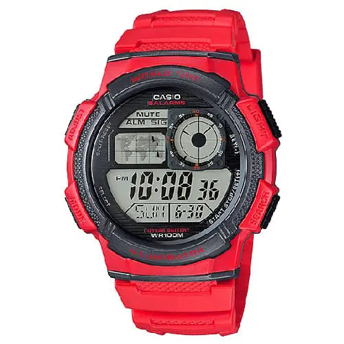 Navigate the globe from your wrist with the Casio World Time Digital AE-1000W-4AVDF Men's Watch. This highly functional timepiece features a clear black digital dial with a graphical world map, allowing you to easily track time in 48 cities worldwide. Built for endurance with its durable red resin strap and 100-meter water resistance, it also offers a 10-year battery life, stopwatch, countdown timer, and multiple alarms. The AE-1000W-4AVDF is the perfect blend of practical features and rugged reliability, offering a bold statement for travelers and everyday adventurers.