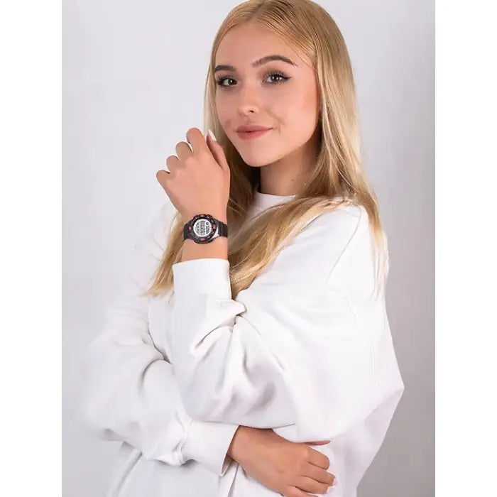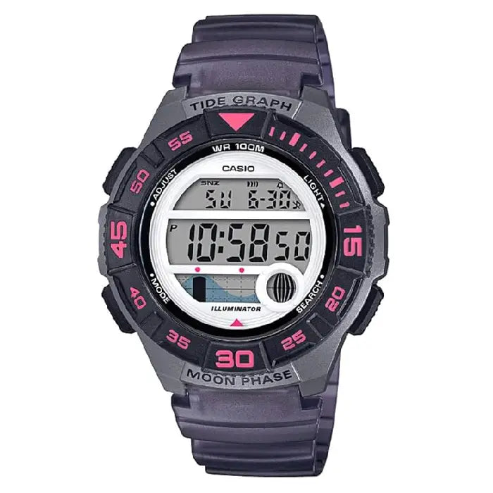 The Casio LWS-1100H-8AVDF is a feature-rich and durable digital watch designed for women who need advanced timekeeping capabilities. Part of the Casio Youth collection, this timepiece features a dual-layer LCD display on a black dial, making it easy to read at a glance. It is housed within a durable resin case and paired with a comfortable grey resin strap. Key features include an auto calendar, a countdown timer, a daily alarm with an hourly time signal, and a powerful LED light for easy reading in low-light conditions. With 100-meter water resistance, this watch is suitable for a wide range of activities, blending advanced functionality with a stylish design.