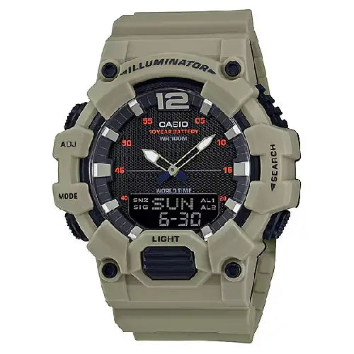 The Casio HDC-700-3A3VDF is a durable and highly functional timepiece designed for adventure. It is part of the Casio Youth collection and features a rugged green resin case and a comfortable, green resin strap. The watch has a unique ana-digi display with a classic black dial, combining analog hands for timekeeping with a digital sub-display for additional functions. Powered by a reliable quartz movement, it boasts a 10-year battery life and 100-meter water resistance, making it suitable for swimming. Key functions include a Telememo databank that can store up to 30 records, a stopwatch, a countdown timer, world time, and 3 daily alarms.