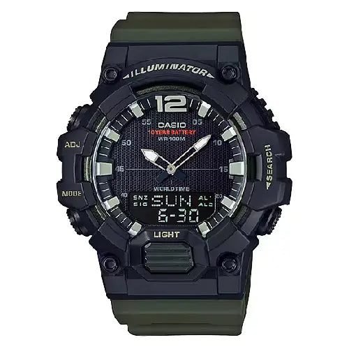 The Casio HDC-700-3AVDF is a durable and highly functional timepiece designed for adventure. It is part of the Casio Youth collection and features a rugged green resin case and a comfortable, green resin strap. The watch has a unique ana-digi display with a classic black dial, combining analog hands for timekeeping with a digital sub-display for additional functions. Powered by a reliable quartz movement, it boasts a 10-year battery life and 100-meter water resistance, making it suitable for swimming. Key functions include a Telememo databank that can store up to 30 records, a stopwatch, a countdown timer, world time, and 3 daily alarms