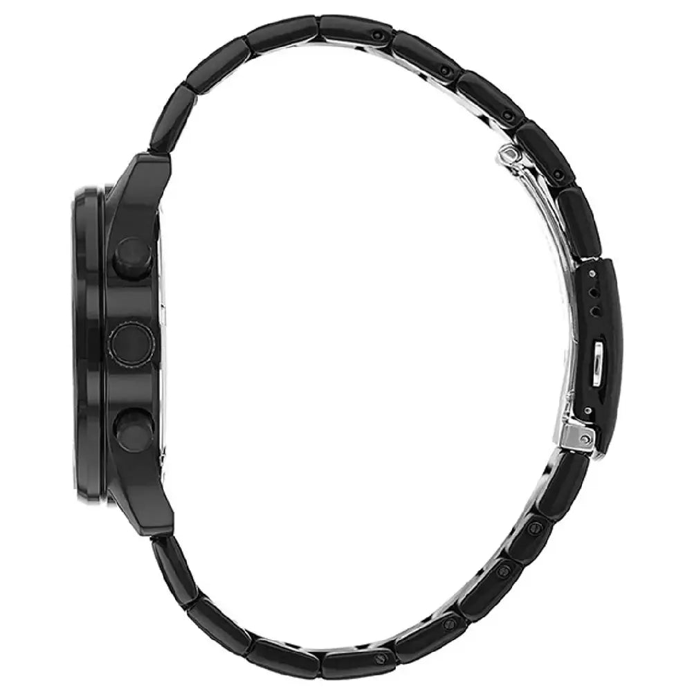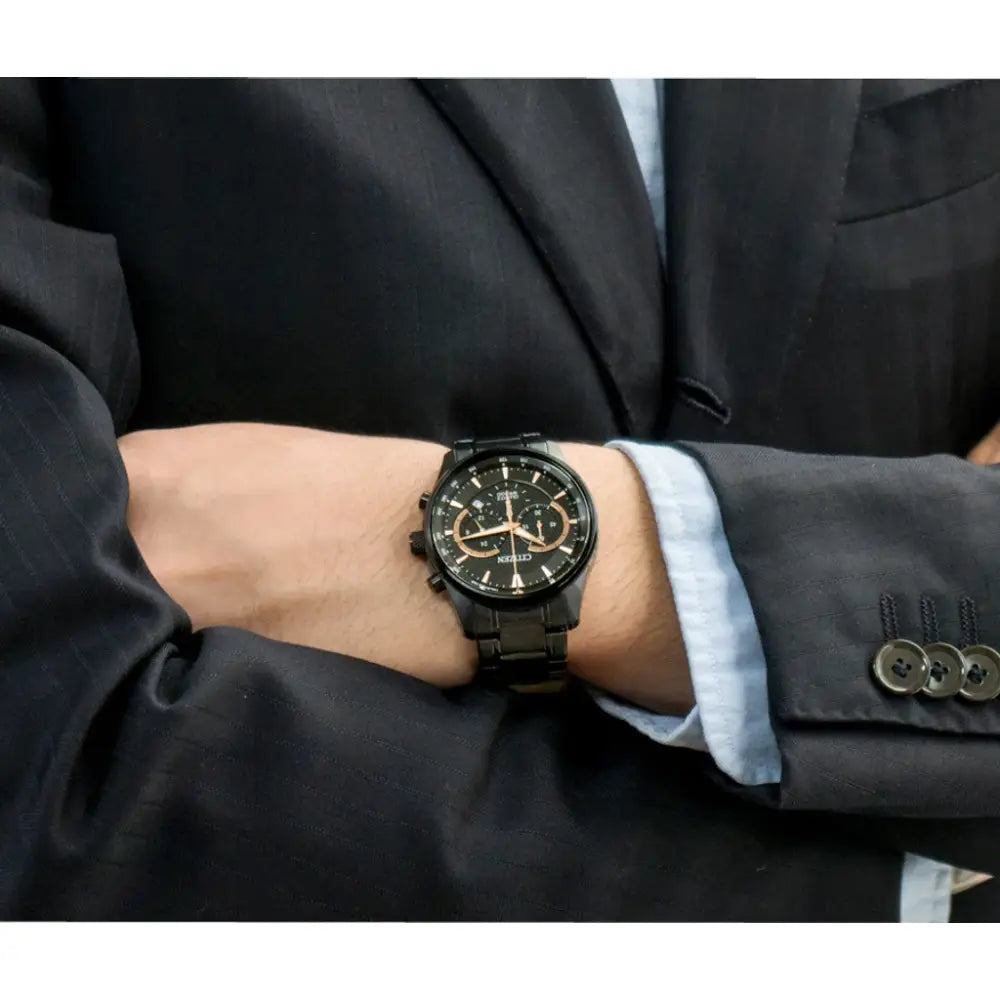 The Citizen Quartz Chronograph AN8195-58E is a sporty and versatile men's timepiece from the Chronograph Collection, offering reliable precision with a striking aesthetic. This watch is powered by a reliable Quartz Chronograph movement (Caliber 0520), ensuring accurate time measurement and low-maintenance functionality. The timepiece features a classic black dial with three functional sub-dials for chronograph measurement (up to 60 minutes) and a 24-hour display. The watch is housed within a durable 42mm stainless steel case that is finished with a sleek black ion-plating (IP) for a stealthy, robust look. It is protected by a scratch-resistant Mineral Crystal. Practical features include a Tachymeter scale on the bezel and a Date display at the 4 o'clock position. It is completed by a matching black ion-plated stainless steel bracelet and offers a water resistance rating of 100 meters (10 Bar), making it suitable for swimming and active wear.