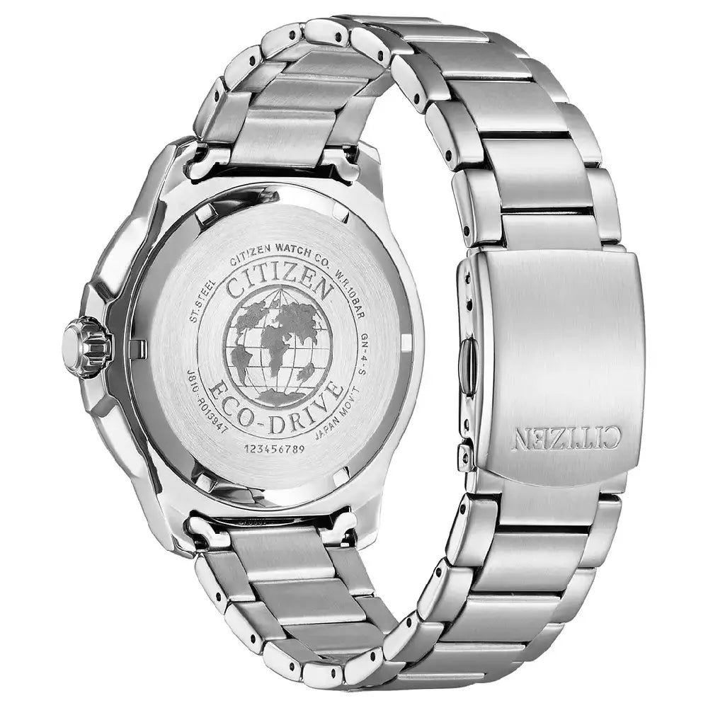 The Citizen Eco-Drive Analog AW1526-89X is a bold and dependable men's timepiece from the Sport collection, featuring a striking color scheme and light-powered technology. This watch is powered by Citizen's reliable Eco-Drive technology (Caliber J810), which continuously converts any light source into energy for the quartz movement, eliminating the need for battery replacements. The timepiece features a unique green patterned dial with large luminous hands and markers for enhanced visibility. The large stainless steel case measures 44.5mm in diameter and features a fixed green and black bezel, giving it a pronounced, sporty look. The dial is protected by a scratch-resistant Mineral Crystal. Practical features include a Date display at the 3 o'clock position. It is completed by a robust stainless steel bracelet and offers a water resistance rating of 100 meters (10 Bar), making it suitable for swimming and active wear.