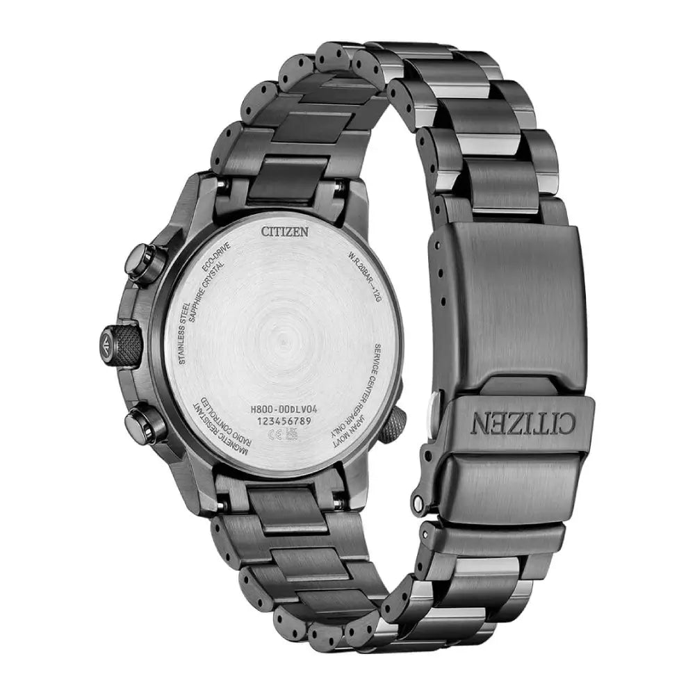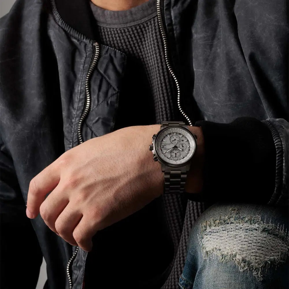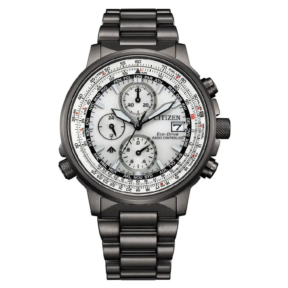 The Citizen Eco-Drive Promaster Navihawk A-T AT8304-57A is a sophisticated and mission-focused pilot's watch, designed for aviation professionals and global travelers. Often referred to as the "Navihawk A-T" (or sometimes "Crono Pilot" in certain markets), this model combines advanced technology with a refined aesthetic, packing powerful features into a manageable 41mm stainless steel case. This watch is powered by the Eco-Drive Radio-Controlled movement (Caliber H800), which charges from any light source and automatically synchronizes with atomic clocks in 4 global regions (Europe, Japan, USA, China) for unparalleled accuracy. The timepiece features a crisp Silver-Tone Dial with high-performance luminous hands and markers, offering excellent legibility. It is framed by a gray ion-plated bezel and an internal aeronautical slide rule for flight calculations. Key features include World Time (26 cities), a 1/20-second chronograph (up to 60 minutes), a perpetual calendar, and a power reserve indicator. The dial is protected by a scratch-resistant Anti-Reflective Sapphire Crystal. Completed by a robust stainless steel bracelet with a fold-over safety clasp, this watch boasts a professional water resistance rating of 200 meters (20 Bar), making it a versatile and reliable companion for any adventure.