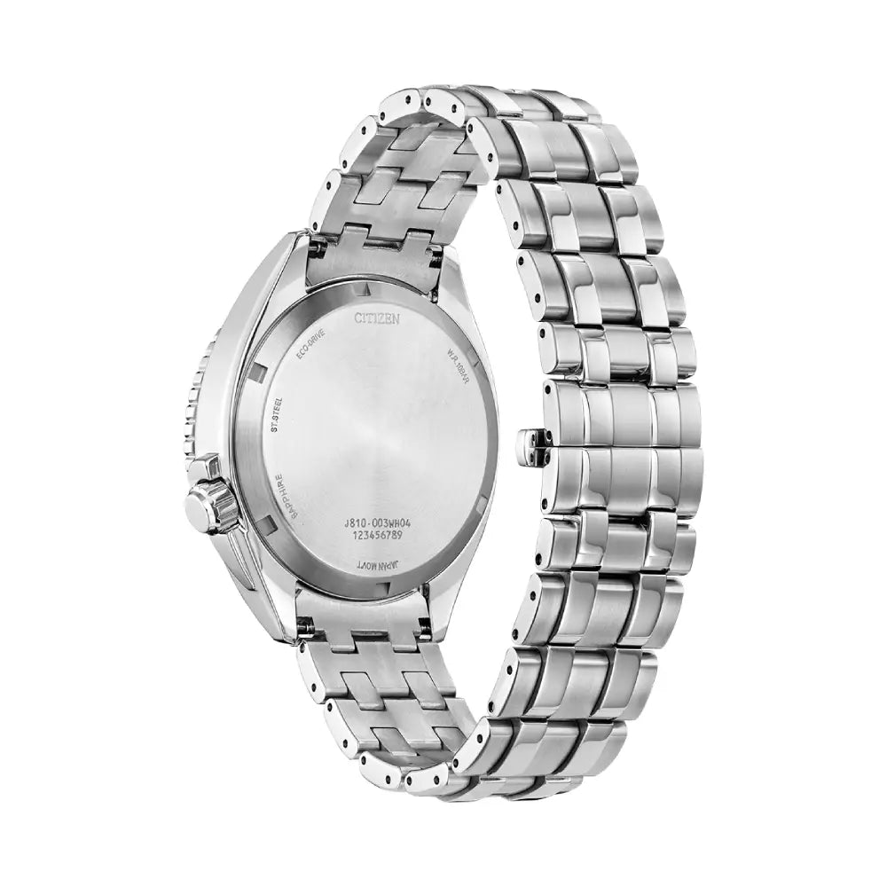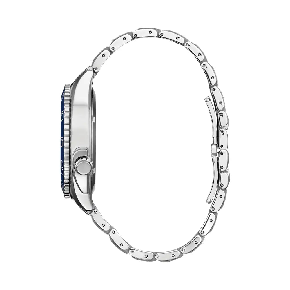 The Citizen Eco-Drive Analog AW1525-81L is a practical and robust men's timepiece that offers dependable, maintenance-free timekeeping in a bold, sporty design. This watch is powered by Citizen's reliable Eco-Drive technology (Caliber J810), which continuously converts any light source into energy for the quartz movement, eliminating the need for battery replacements. The timepiece features a captivating Blue Dial with prominent luminous hands and markers for enhanced visibility. The large stainless steel case measures 42mm in diameter and has a slim 10.8mm thickness. The dial is protected by a scratch-resistant Mineral Glass. Practical features include a Date display at the 3 o'clock position and an overcharge prevention function. It is completed by a robust stainless steel bracelet with a triple-fold clasp and offers a water resistance rating of 100 meters (10 Bar), making it suitable for swimming and active wear.