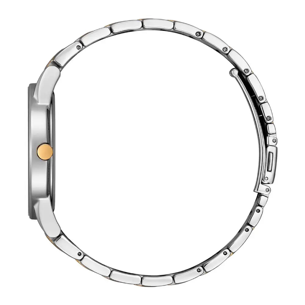The Citizen AU1064-85A, prominently known as the "Axiom", is a masterclass in modern minimalist design, offering a sleek, contemporary aesthetic tailored perfectly for the discerning Noon shopper. This sophisticated timepiece features a perfectly proportioned 40mm Stainless Steel Case with an ultra-slim 8mm profile, allowing it to slide effortlessly under any dress shirt cuff. The edge-to-edge glass construction gives the watch a seamless, bezel-less appearance, amplifying its futuristic yet highly refined dress-watch appeal. This specific model introduces a luxurious two-tone finish, gracefully blending silver-tone stainless steel with warm Rose Gold-Tone accents on the crown, hands, and bracelet center links. The dial is a crisp, unembellished Silver, embodying the essence of the Axiom collection's "less is more" philosophy. It eschews traditional numerals in favor of a single, striking rose gold-tone baton marker at the 12 o'clock position, complemented by sharp, matching rose gold-tone hands. A discreet date window is elegantly positioned at 3 o'clock, maintaining the dial's clean symmetry while providing essential daily utility. The watch face is protected by a highly durable, scratch-resistant Mineral Crystal that ensures long-lasting clarity for everyday wear. Underneath its minimalist exterior lies the highly advanced Citizen Caliber J165 Eco-Drive Movement. This revolutionary technology harnesses power from any natural or artificial light source, completely eliminating the need for battery replacements and providing months of continuous operation on a single charge. Secured by a polished and brushed two-tone Stainless Steel Men's Watch configuration featuring a secure push-button fold-over clasp, and offering reliable 30-meter water resistance, the Citizen Axiom is the ultimate choice for the modern trendsetter who values sustainable precision and uncluttered style.