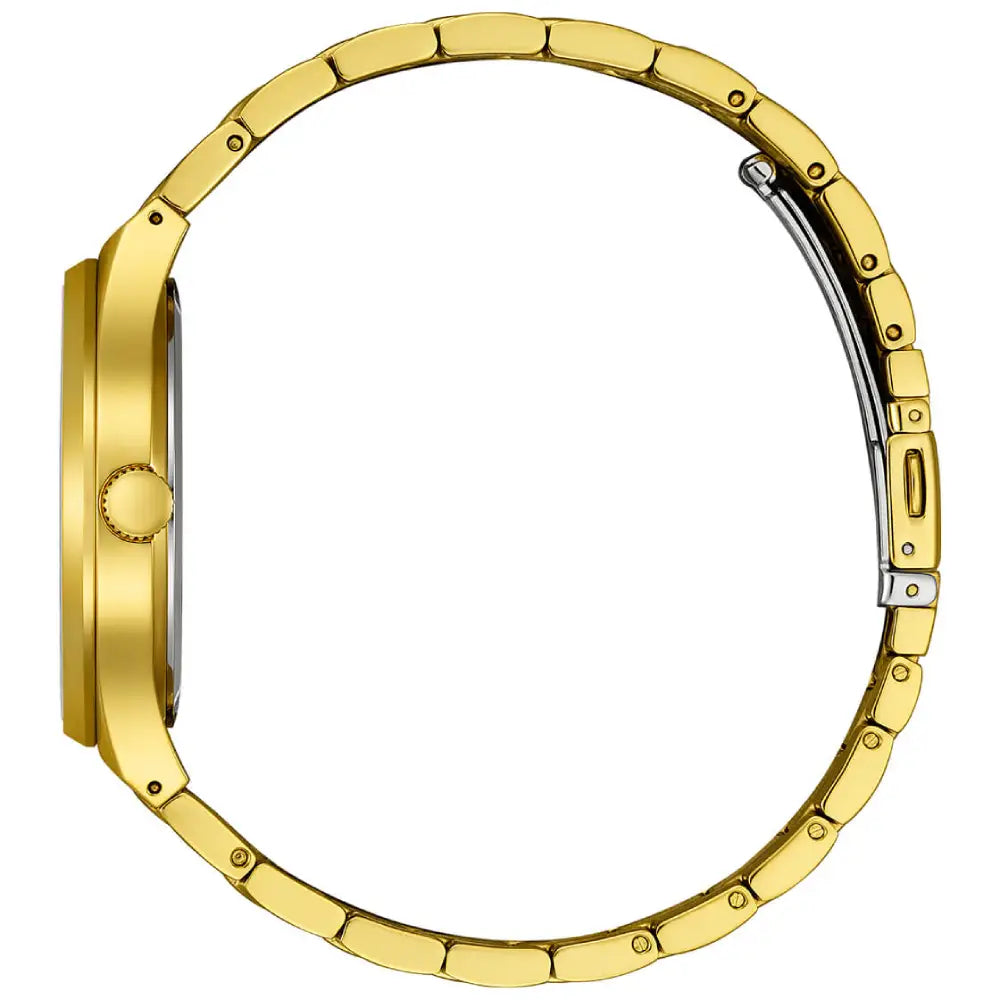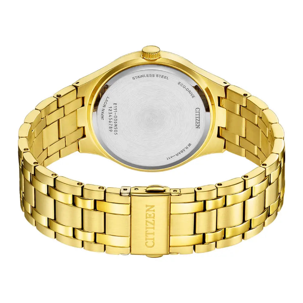 The Citizen BM7652-52P is a refined timepiece from the "Axiom" (or Classic Eco-Drive) collection, offering a radiant and sophisticated aesthetic for the modern gentleman. This model features a stunning Champagne Dial that perfectly complements its gold-tone exterior, creating a seamless, monochromatic luxury look. The dial is minimalist and elegant, adorned with sleek gold-tone baton indices and hands, ensuring high legibility while maintaining a clean, dressy profile. Housed in a polished 40mm Stainless Steel Case with a rich Gold-Tone Plating, the watch commands presence without being overpowering. It is designed to slide easily under a cuff, thanks to its slim 9.3mm profile. The watch is powered by Citizen’s legendary Eco-Drive Technology (Caliber E111), which harnesses energy from any light source natural or artificial eliminating the need for battery replacements. The timepiece is paired with a matching Gold-Tone Stainless Steel Men's Watch bracelet that secures with a fold-over clasp and push-button release. Protected by a durable Mineral Crystal and rated for 50-meter water resistance, the BM7652-52P balances its jewelry-like appearance with practical durability, making it an ideal choice for both boardroom meetings and evening events.