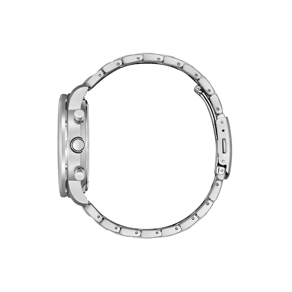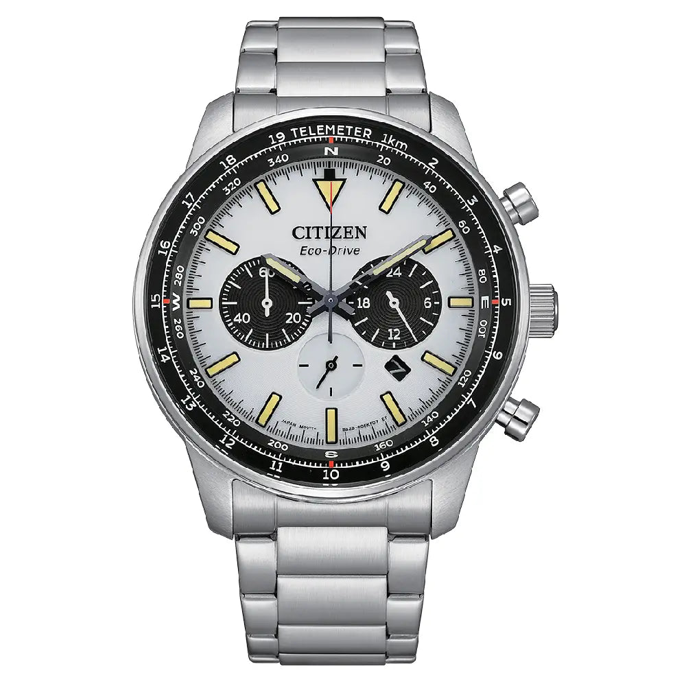 The Citizen Eco-Drive Chronograph CA4500-91A is a sophisticated and robust men's timepiece, recognized by enthusiasts as a classic "Panda Style" chronograph due to its high-contrast white dial and dark sub-dials. This watch is a perfect accessible pilot timepiece, blending an aviation-inspired design with sustainable technology. This watch is powered by Citizen's innovative Eco-Drive technology (Caliber B620), utilizing a reliable solar-charged quartz movement that harnesses energy from any light source, ensuring continuous operation with a 9-month power reserve on a full charge. The timepiece features a crisp white dial with three functional sub-dials for chronograph measurement and a 24-hour display. The large stainless steel case measures a bold 44mm in diameter and is protected by a durable Mineral Crystal. The CA4500-91A is completed by a robust stainless steel bracelet and offers a water resistance rating of 100 meters (10 Bar), making it ideal for swimming and active wear.