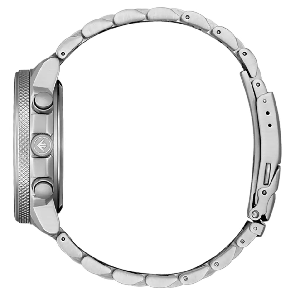 The Citizen Eco-Drive Atomic Chronograph CB5861-59E is a feature-rich, high-performance men's timepiece from the Promaster Sky collection, built for aviation and global travel. This watch is powered by Citizen's reliable Eco-Drive technology (Caliber E660), utilizing light energy to power the quartz movement continuously and sustainably, eliminating the need for battery replacements. Its standout feature is Atomic Timekeeping (Global Radio-Controlled synchronization), which automatically adjusts the time in 26 World Cities and maintains superior accuracy across time zones. The timepiece features a striking black dial with multiple sub-dials and is housed within a durable stainless steel case that measures 43.7mm in diameter. It is protected by a scratch-resistant Sapphire Crystal and features essential functions including a Perpetual Calendar, 1/1-second Chronograph (up to 60 minutes), and a Power Reserve Indicator. The CB5861-59E is completed by a robust stainless steel bracelet and offers a water resistance rating of 200 meters (20 Bar).