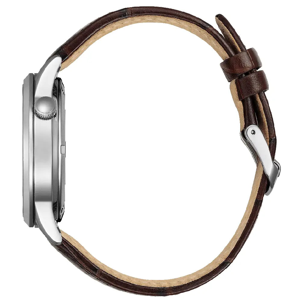 Experience a captivating blend of classic elegance and mechanical artistry with the Citizen Mechanical Automatic Open Heart NH9130-17A men's watch. This sophisticated timepiece features a stunning white dial with a champagne line pattern and Roman numeral markings. The "Open Heart" window provides a mesmerizing view of the intricate mechanical movement within, all housed within a refined 40mm stainless steel case. At the heart of this watch is a reliable automatic movement that is powered by the motion of your wrist. The watch is protected by a scratch-resistant sapphire crystal and is complemented by a high-quality brown genuine leather strap. With a water resistance of 50 meters, the Citizen NH9130-17A is a perfect choice for those who appreciate the artistry of watchmaking and a unique aesthetic.