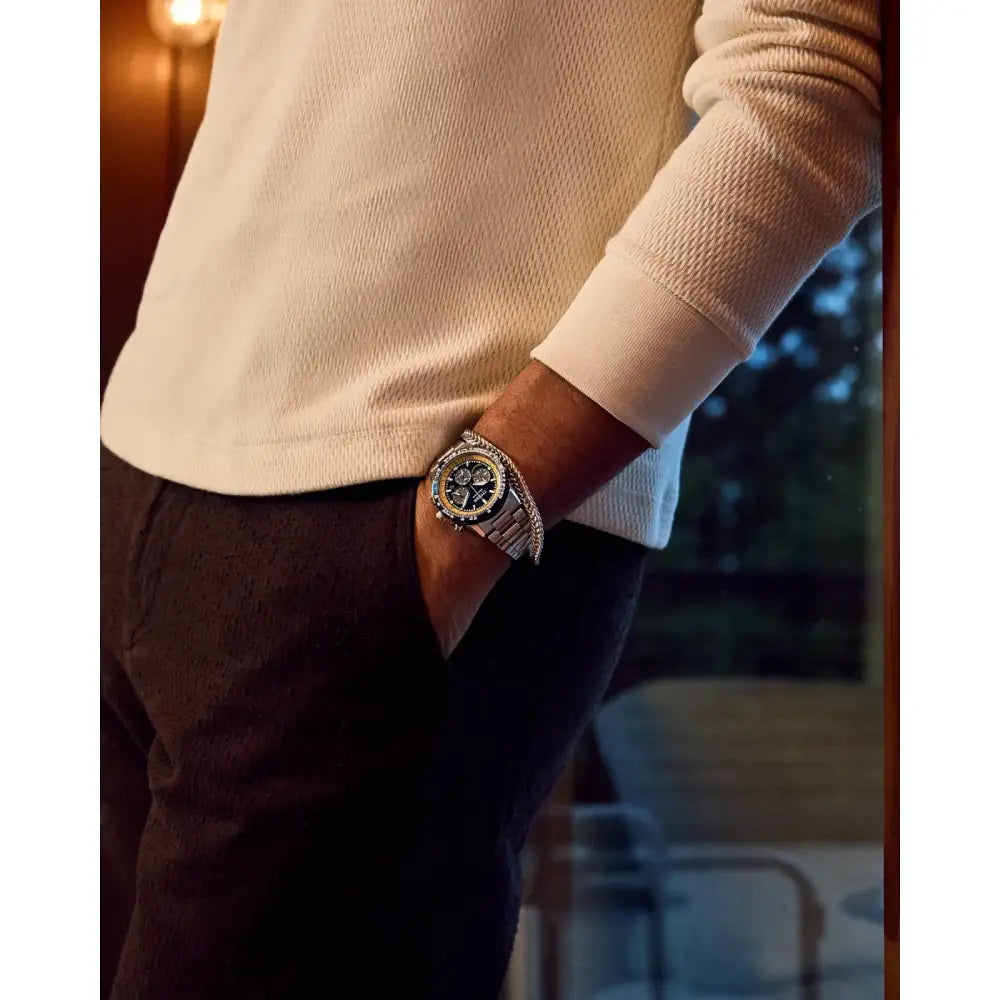 Take to the skies with the Citizen Promaster Air Navihawk Eco-Drive Chronograph CA4667-53L men's watch, a professional-grade timepiece built for pilots and adventurers. This watch features a captivating blue dial with three functional sub-dials and a slide rule bezel, all housed within a refined 40mm stainless steel case. Powered by Citizen's innovative Eco-Drive technology, this watch is charged by any light source and never requires a battery change. The chronograph functionality allows for precise time measurement with a 1/5-second counter up to 60 minutes. It also includes a convenient date display. Complemented by a robust stainless steel bracelet and a water resistance of 100 meters, the Citizen CA4667-53L is a dependable and stylish accessory for those who demand both precision and performance.