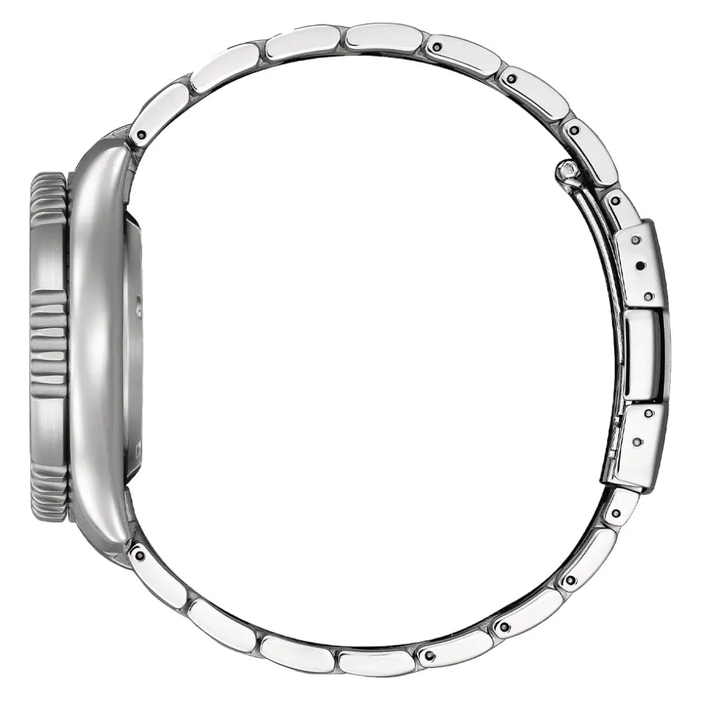 The Citizen Promaster Automatic Diver NY0161-63L is a robust and visually striking men's diving watch built to meet ISO standards for professional diving. This timepiece is a Limited Edition model, affectionately nicknamed the "Fugu" (Japanese Pufferfish) due to its distinctive serrated bezel design and case back engraving. This watch is powered by a dependable Japanese Automatic Movement (Caliber 8204), which is self-winding and features a power reserve of approximately 40 hours, along with manual winding and hacking. The watch features a captivating blue dial with large luminous hands and markers. The case measures a substantial 42mm in diameter and features a unidirectional rotating bezel for precise elapsed dive time measurement. Protected by Mineral Crystal, the NY0161-63L includes a Day and Date display and essential safety features like a screw-down crown and screw case back, ensuring a professional water resistance rating of 200 meters (20 Bar). It is completed by a robust stainless steel bracelet.