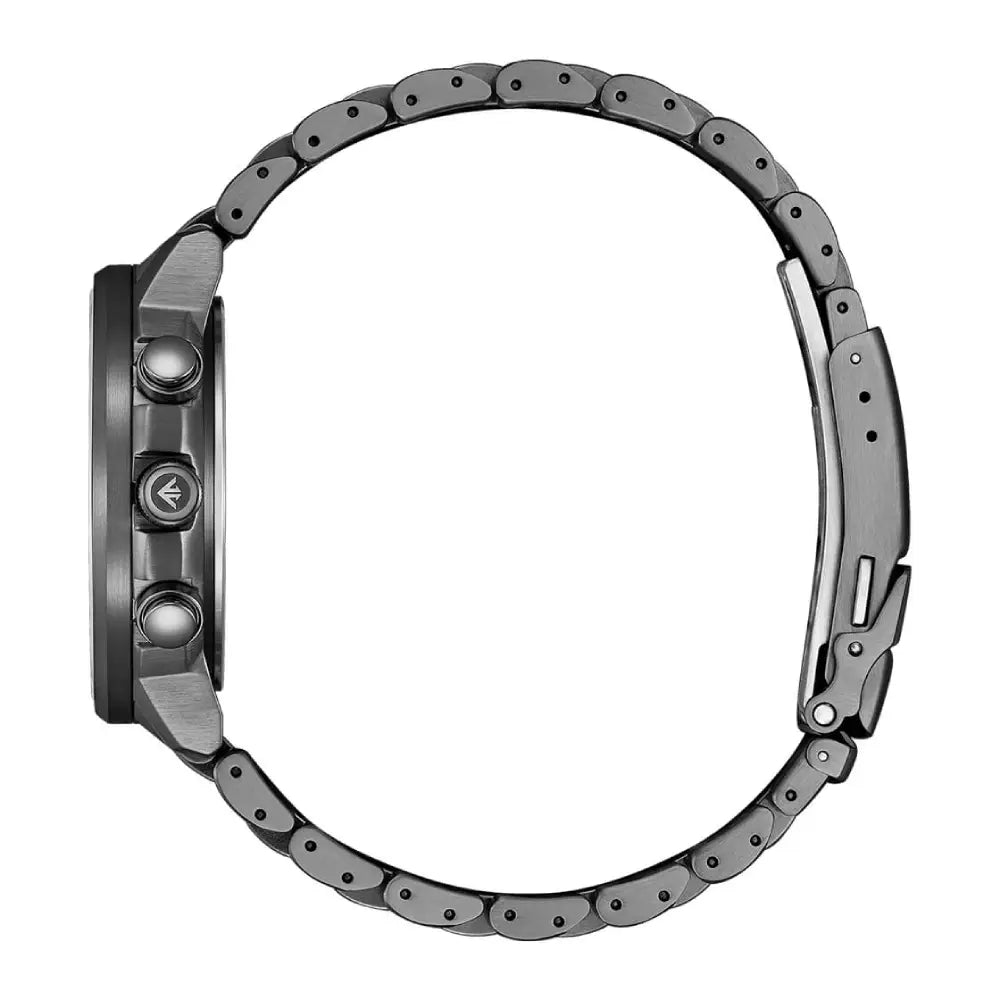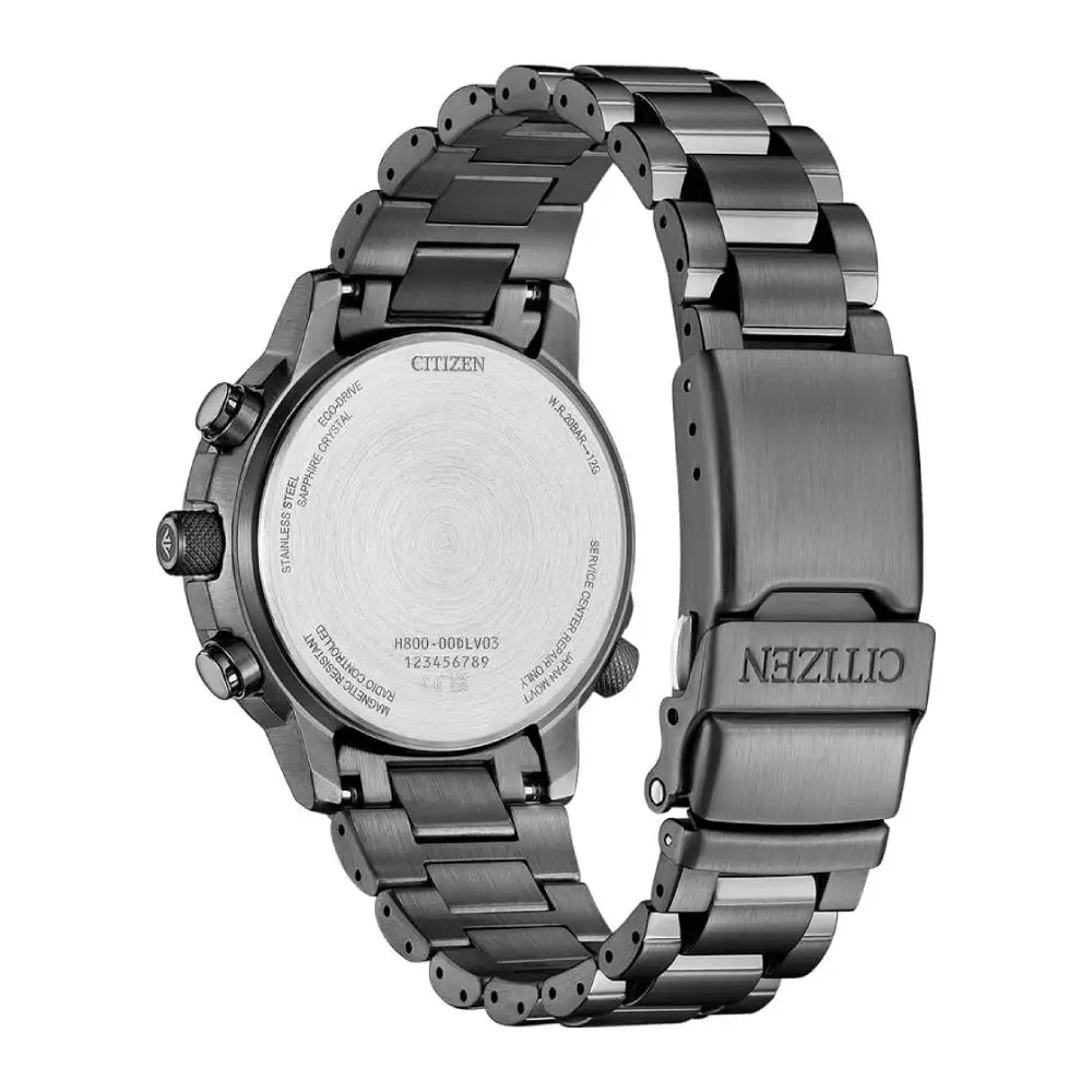 The Citizen AT8304-57W, widely known among aviation watch enthusiasts as the Promaster Sky Navihawk A-T (or the Eco-Drive Pilot), is a mission-focused powerhouse that perfectly balances high-tech functionality with sleek, modern aesthetics. Engineered for professionals and everyday wearers alike, this model features a versatile 41mm Stainless Steel Case finished in a striking matte Grey (often referred to as gunmetal or grey ion-plated). This robust sizing offers a comfortable, contemporary fit that slides easily under a cuff while maintaining a strong wrist presence. The dial is a sophisticated Green, providing a rich backdrop for the high-contrast silver-tone hands and markers, ensuring instant legibility at a glance. The inner rotating ring features an aeronautical slide rule, a signature of the Promaster Sky series, operated via the crown at the 8 o'clock position. Protected by a premium, scratch-resistant Sapphire Crystal with anti-reflective coating, the watch face remains pristine even in the most demanding environments. At the heart of this timepiece is the advanced Citizen Caliber H800 Eco-Drive Movement. This light-powered engine eliminates the need for battery replacements and features Radio-Controlled Atomic Timekeeping, meaning it automatically synchronizes with atomic clocks across 26 time zones for unparalleled accuracy. The multi-functional dial includes a 1/20-second chronograph, a perpetual calendar (with day and date), and a power reserve indicator. Secured by a matching Grey Stainless Steel Men's Watch setup with a secure fold-over clasp, and boasting 200-meter water resistance, the AT8304-57W is the ultimate Noon-ready tool watch for the modern global traveler.