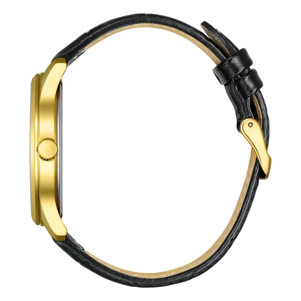 The Citizen BH5002-02E is a sleek and authoritative dress watch that combines timeless elegance with a bold modern profile. This timepiece features a deep Black Dial that serves as a striking contrast to the warm, luxurious Gold-Tone Stainless Steel case. The dial is minimalist and refined, adorned with gold-tone baton indices and hands that ensure high legibility while maintaining a sophisticated, uncluttered look. Housed in a 42mm case, the watch offers a contemporary size that commands presence on the wrist without being overly bulky. It is secured by a high-quality Black Leather Strap with a comfortable buckle closure, enhancing its dressy appeal and making it perfect for business suits or formal evening wear. Powered by a precision Quartz Movement, this model is designed for reliability and low maintenance, ensuring you are always on time. It features a practical Date Display at the 3 o'clock position for everyday utility. Protected by a durable Mineral Crystal and rated for 50-meter water resistance, the BH5002-02E is a durable yet stylish companion for the modern gentleman who values both form and function.