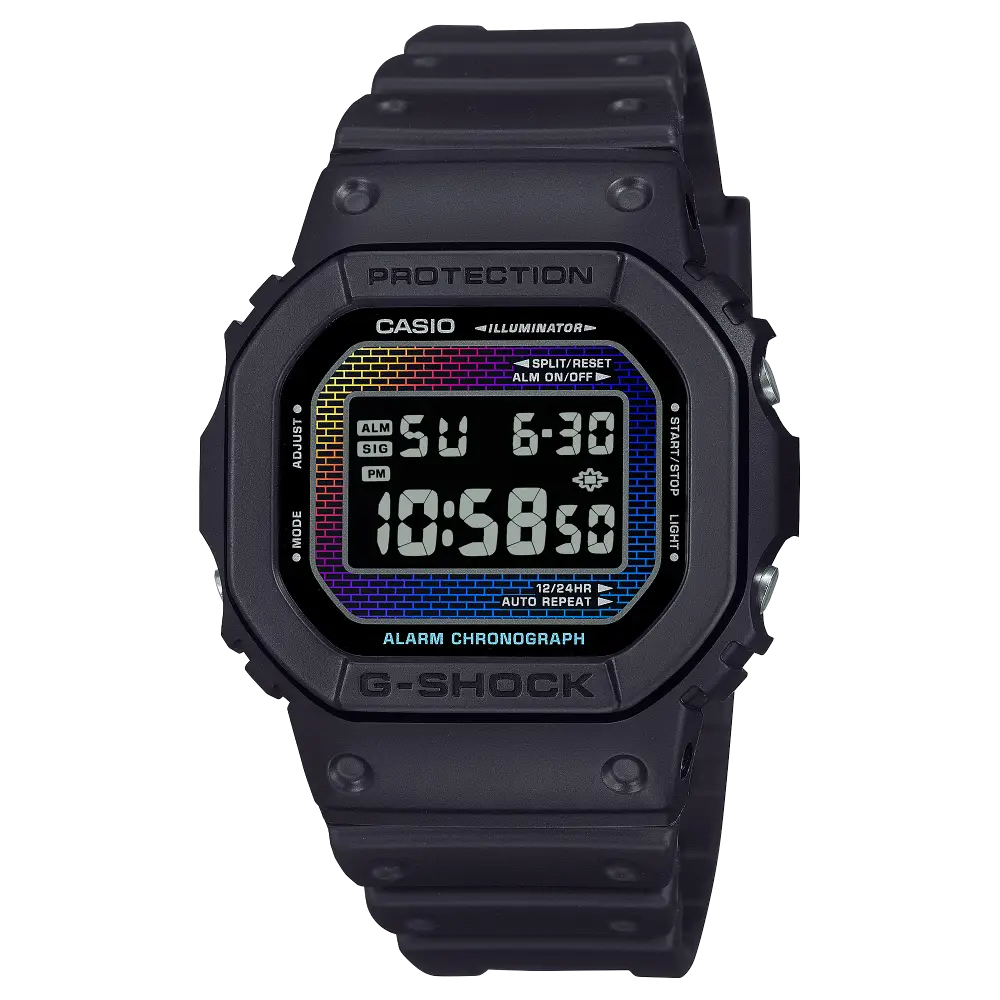 Another brick in the wall — this one in a full rainbow of color. Introducing bold designs with watch glass or dial featuring the original brick wall pattern of the very first G-SHOCK in full-on color. Rainbow vapor deposition reproduces the symbolic brick wall imagery in brilliant rainbow hues that shift and change depending on the light. The colorful design stays true to the origin of G-SHOCK with the spirit of toughness it takes to overcome barriers and constantly push limits. Choose your favorite from the iconic 5600 models or the 2100 analog-digital combination models. For the DW-5600 and GM-5600 models, the watch glass features the color-shifting brick pattern reproduced with vapor deposition in a rainbow-hued gradation. For the GA-2100 and GM-2100 models, the dial’s iridescent brick pattern is achieved with a combination of silver vapor deposition, laser etching, and rainbow-colored printing. A cool, colorful fashion accessory with a dynamic design that wows from every angle.