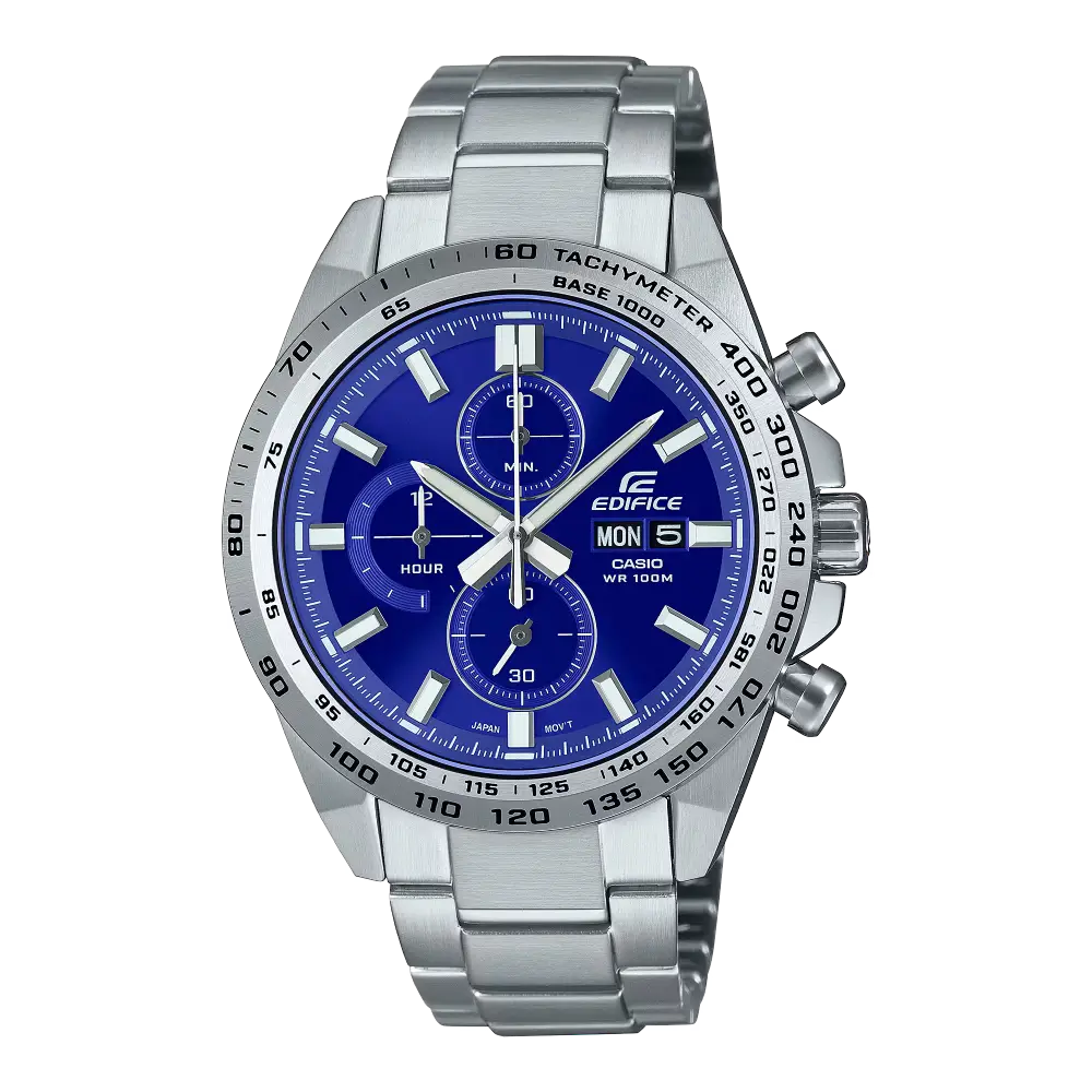Make a dynamic, bold statement with the classic EDIFICE chronograph in a design that is all about sports. The beautifully bold blue dial offers a day and date display for handy reference.