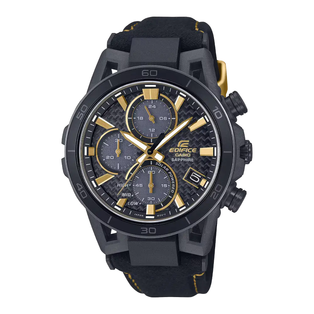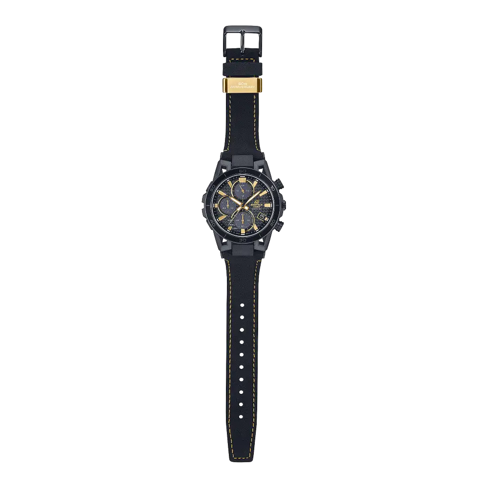 Celebrate 50 years of Casio watches with the EDIFICE SOSPENSIONE Men's Watch. This solar-powered chronograph features a black and gold color scheme, evoking the excitement of creating something new. The gold band loop, engraved with "50th ANNIVERSARY," adds a special touch while the inset dial at the 9 o'clock position adds a sleek design element.