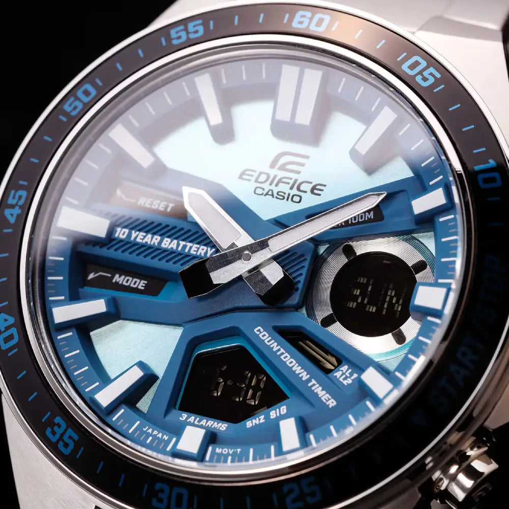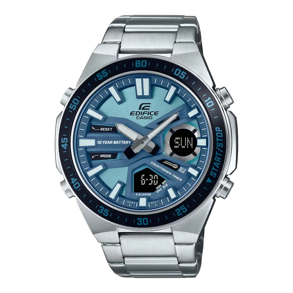 Stay worry-free with the EDIFICE STANDARD CHRONOGRAPH MEN WATCH EFV-C110D-2BDF. This analog-digital combination timepiece boasts a 10-year battery life, allowing you to focus on life without interruptions. With its dynamic and sporty face design and multiple functions like world time and stopwatch, it's the perfect companion for any adventure.