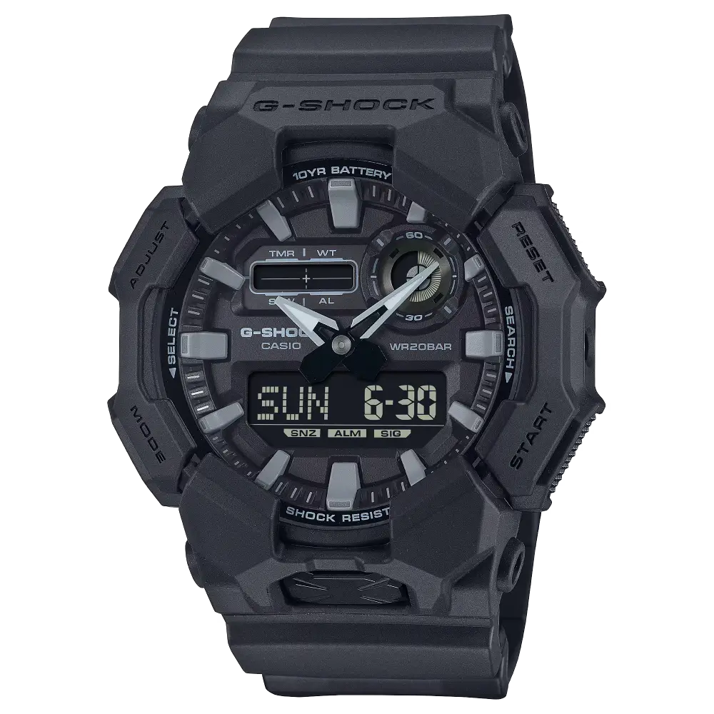 With a totally cool large-case G-SHOCK in black with a long battery you won’t have to worry about for ages. The analog-digital GA-010 offer handy features like world time and stopwatch, with a large, easy to read display and large case. The front button makes it simple to access the high-brightness LED light so you can easily read the dial, even in the dark. Made with bio-based resin and equipped with a 10-year battery, this G-SHOCK is designed to be good for the environment — and good for fashion. These black design move with ease from casual styling to work setting.
