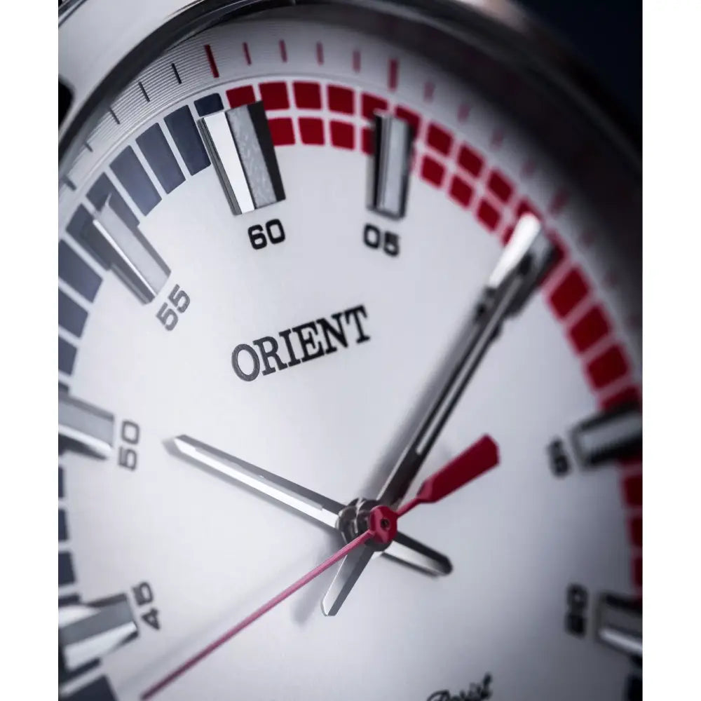 The Orient Contemporary Quartz SQC0U004W0 (also known as QC0U004W) is a sleek and practical men's timepiece designed for everyday elegance. This watch is powered by a reliable Quartz movement (Caliber RH500), ensuring precise timekeeping and low maintenance. The timepiece features a clean White Dial (sometimes described as silver) with silver hands and a subtle blue/red one-fifth second chapter ring for added detail. The watch is housed within a durable 43mm stainless steel case with a slim 9mm thickness. It is protected by a scratch-resistant Mineral Glass. Practical features include a screw case back and a water resistance rating of 50 meters (5 Bar). It is completed by a matching stainless steel bracelet.