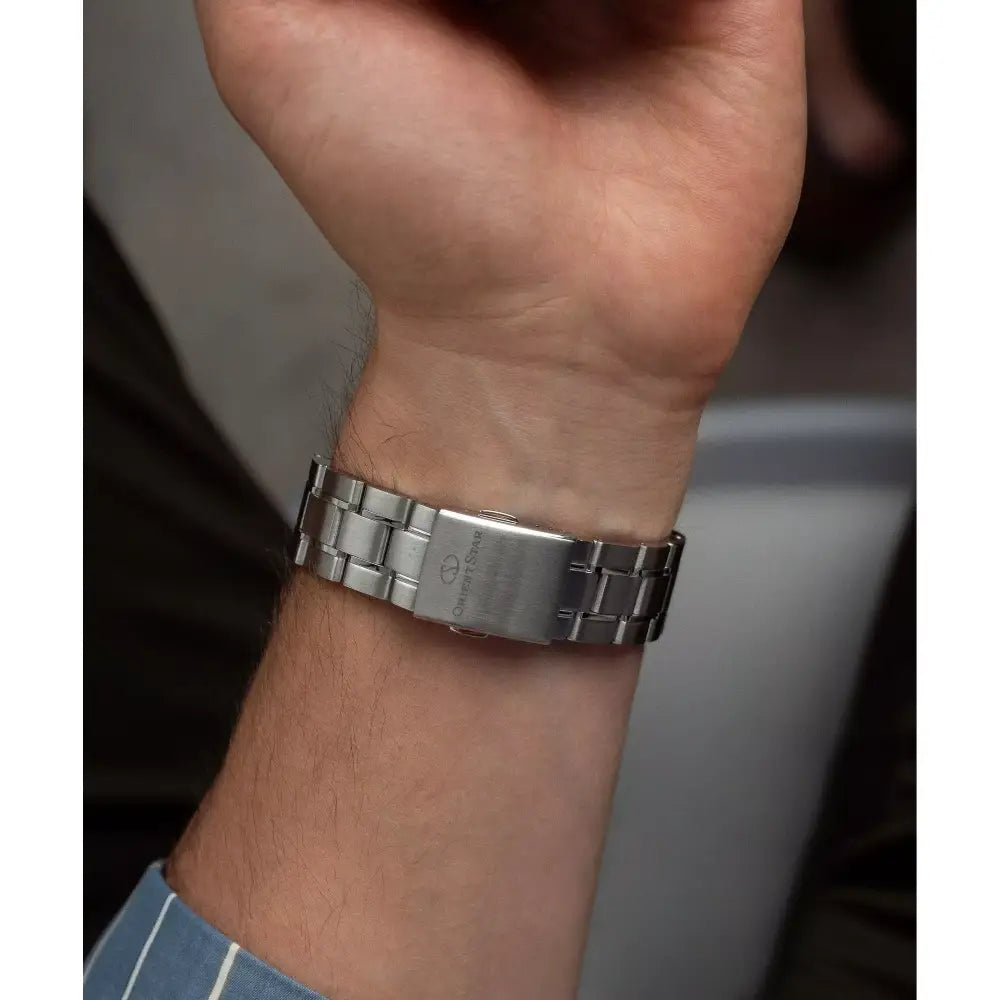 The Orient Star Automatic Open Heart RE-AT0021L00B is a premier mechanical timepiece from the prestigious Orient Star Contemporary collection. This is a Limited Edition of 900 pieces worldwide, part of the "Keshiki" (beautiful Japanese landscape) theme, with a dial color inspired by "snowlight" reflecting off snow-covered ground, softly illuminating the surroundings. This watch is powered by a high-performance in-house Mechanical Automatic Movement (Caliber F6R42, Made in Japan) with 22 jewels. It features manual winding, hacking, and a stable 50-hour power reserve. The timepiece features a sophisticated Blue Dial with a deep navy blue gradation in the upper half. The design includes a characteristic Semi-Skeleton or Open Heart aperture at the 9 o'clock position, complemented by a Power Reserve Indicator at 12 o'clock. The case is constructed from durable stainless steel and measures a highly wearable 39mm in diameter. It is protected by a scratch-resistant Sapphire Crystal with anti-reflective coating. The movement is visible through a See-Through Caseback, and each piece is engraved with a unique serial number. It is completed by a robust stainless steel bracelet and offers a water resistance rating of 100 meters (10 Bar).