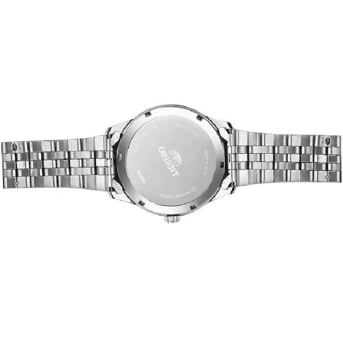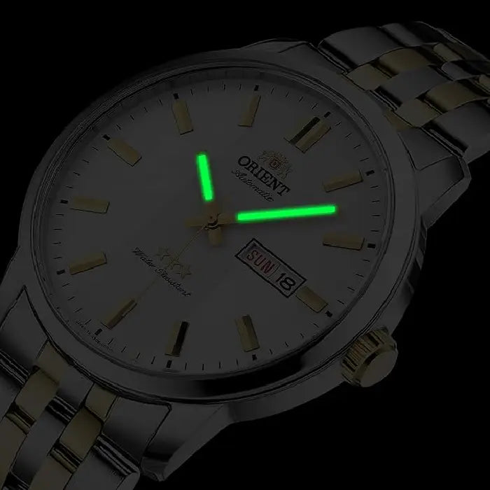The Orient SAB0B008WB is a distinguished member of the legendary "Tristar" (or 3-Star) collection, a series celebrated worldwide for its robustness, reliability, and timeless design. This specific model represents a modern evolution of the classic Tristar aesthetic, featuring a larger, more contemporary 43mm Stainless Steel Case that commands presence on the wrist while retaining the vintage charm of its predecessors. The case is finished with a blend of brushed and polished surfaces, creating a versatile look suitable for both the boardroom and casual outings. The dial is a brilliant Silver-White, offering a clean and sophisticated backdrop that enhances the watch's readability. It is adorned with elegant Gold-Tone hands and applied baton hour markers, adding a touch of warmth and luxury to the otherwise monochromatic steel profile. A classic day-and-date window is positioned at the 3 o'clock mark, a signature feature of the Tristar lineage. The dial is protected by a durable Mineral Crystal, designed to withstand the rigors of daily use. At its heart beats the robust Orient Caliber F4902 Automatic Movement, a workhorse engine that winds itself with the motion of your wrist, eliminating the need for batteries. The watch is secured by a sturdy Stainless Steel Men's Watch bracelet with a fold-over clasp, and with 50-meter water resistance, it is built to handle the splashes and demands of everyday life with ease.