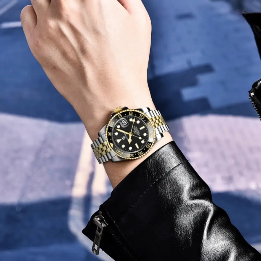 The Pagani Design PD1662 is a stylish and reliable automatic watch that brings a classic design with modern performance. Built with a solid stainless steel case, it features a striking black dial that’s protected by a synthetic sapphire crystal for extra durability. Powered by the dependable Pearl DG5833GMT automatic movement, this watch keeps time with precision and requires no batteries. With a 40mm case diameter and a 14mm thickness, it’s the perfect size for most wrists, offering a comfortable fit. The 220mm stainless steel band with a 20mm width adds a touch of sophistication, and the 48mm lug-to-lug distance ensures it sits just right. Weighing in at 148 grams, the PD1662 has a solid feel on the wrist that complements its robust design.