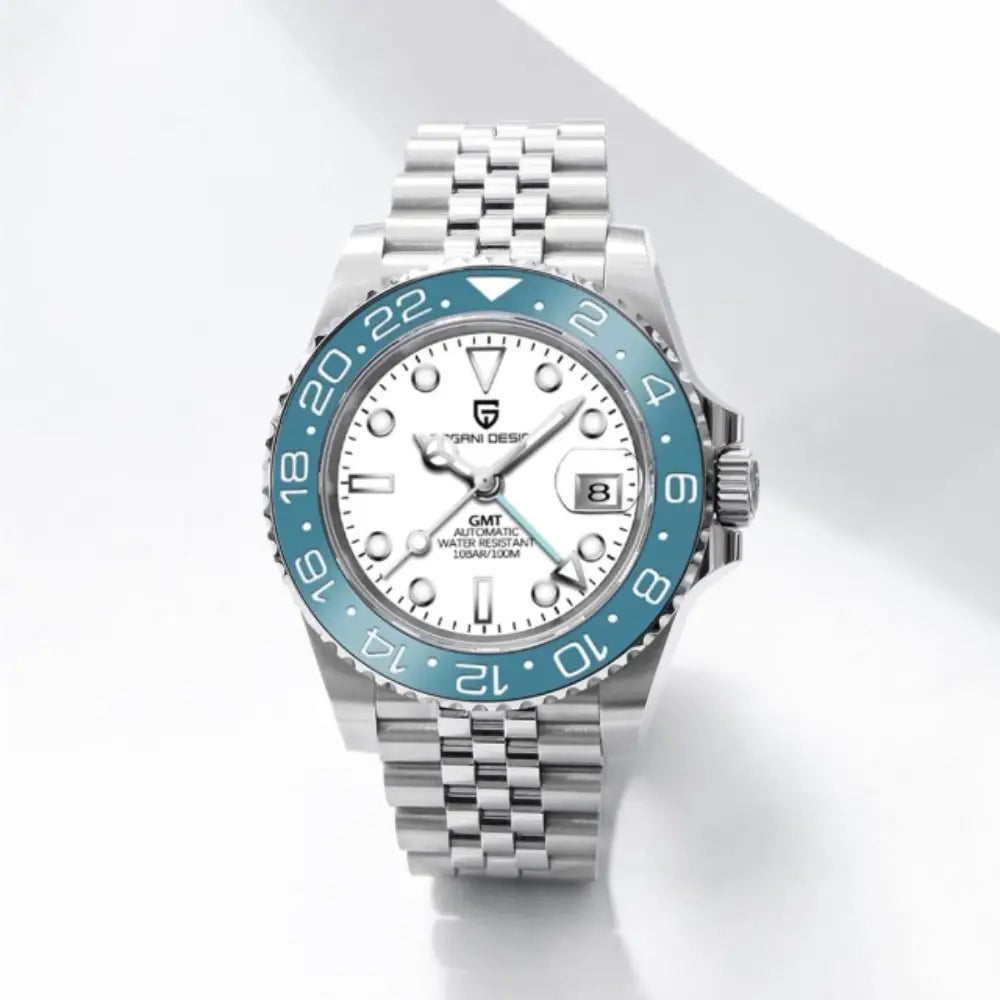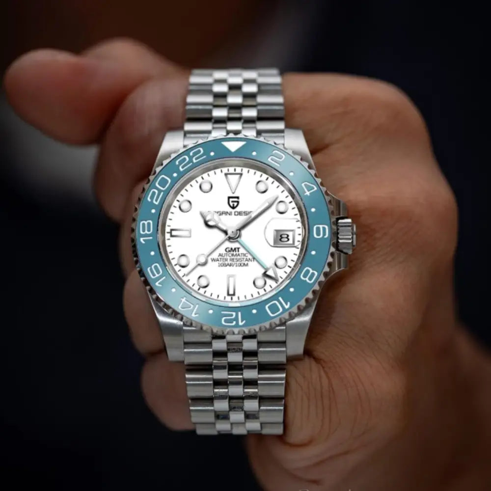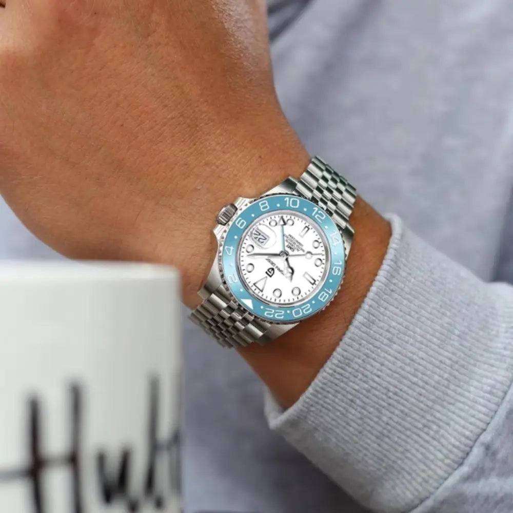 The Pagani Design PD1662 is a stylish and reliable automatic watch that brings a classic design with modern performance. Built with a solid stainless steel case, it features a striking black dial that’s protected by a synthetic sapphire crystal for extra durability. Powered by the dependable Pearl DG5833GMT automatic movement, this watch keeps time with precision and requires no batteries. With a 40mm case diameter and a 14mm thickness, it’s the perfect size for most wrists, offering a comfortable fit. The 220mm stainless steel band with a 20mm width adds a touch of sophistication, and the 48mm lug-to-lug distance ensures it sits just right. Weighing in at 148 grams, the PD1662 has a solid feel on the wrist that complements its robust design.